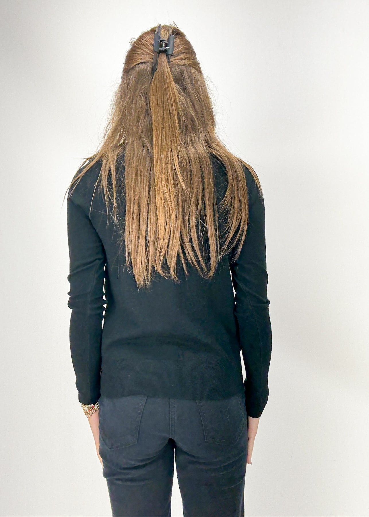 It's all in the details! This classic black top features a subtle mock neckline and studded sleeves for a fun twist.