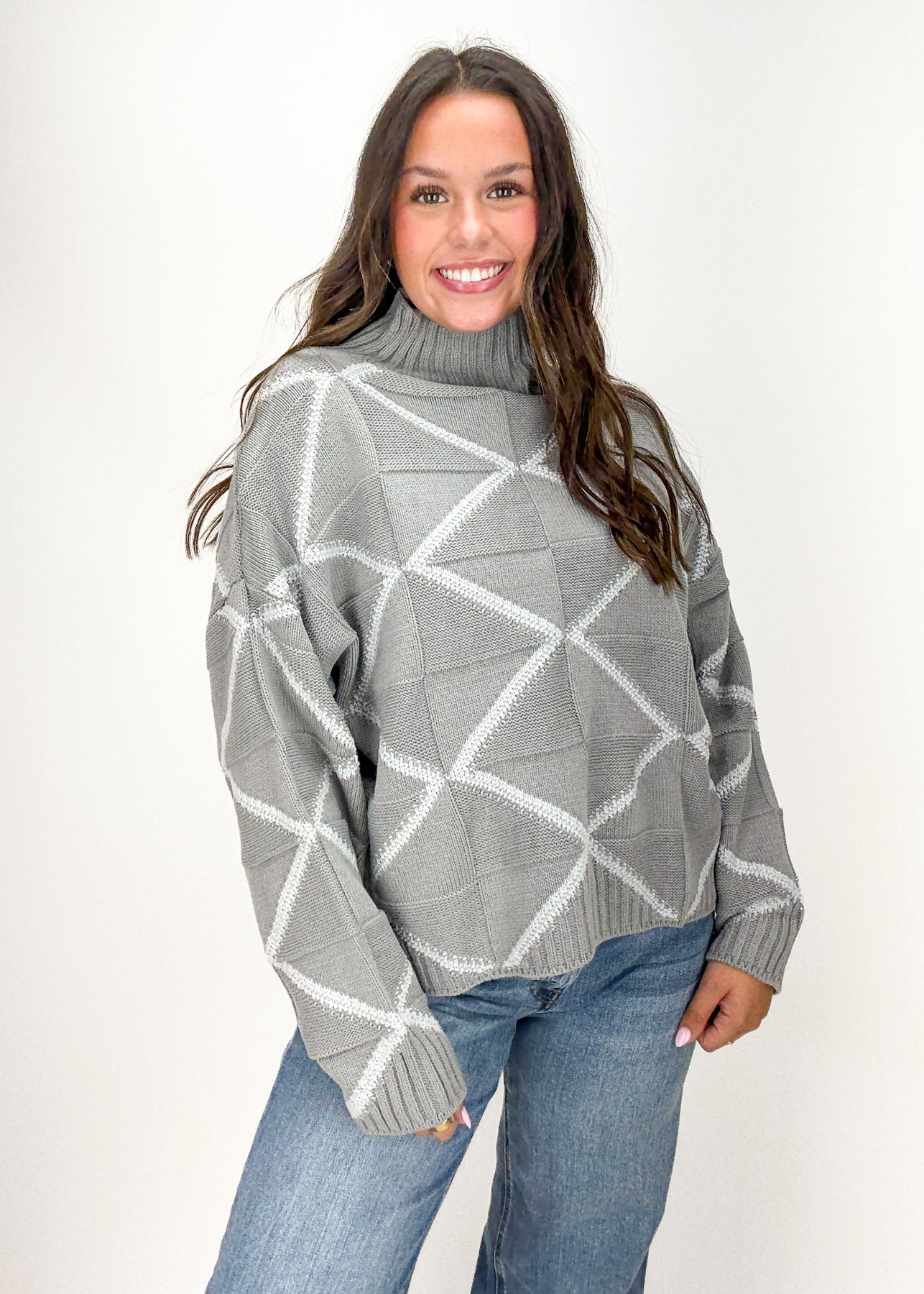 This cozy, oversized sweater features an exaggerated mock neckline and a grey and white pattern. Perfect for pairing with a colored pant, this piece is a must have!