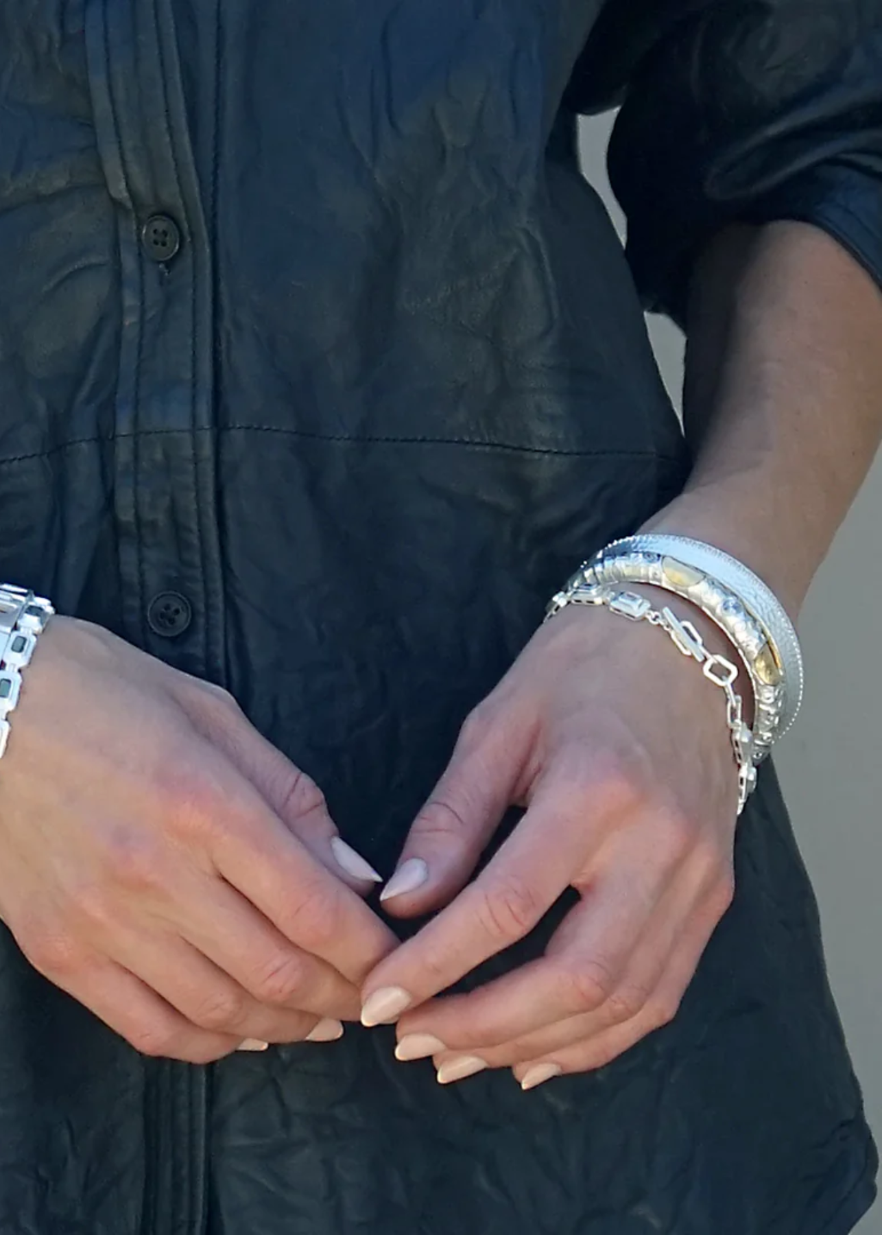 Woman wearing silver jeweling including a silver bangle bracelet with gold coin and CZ studding