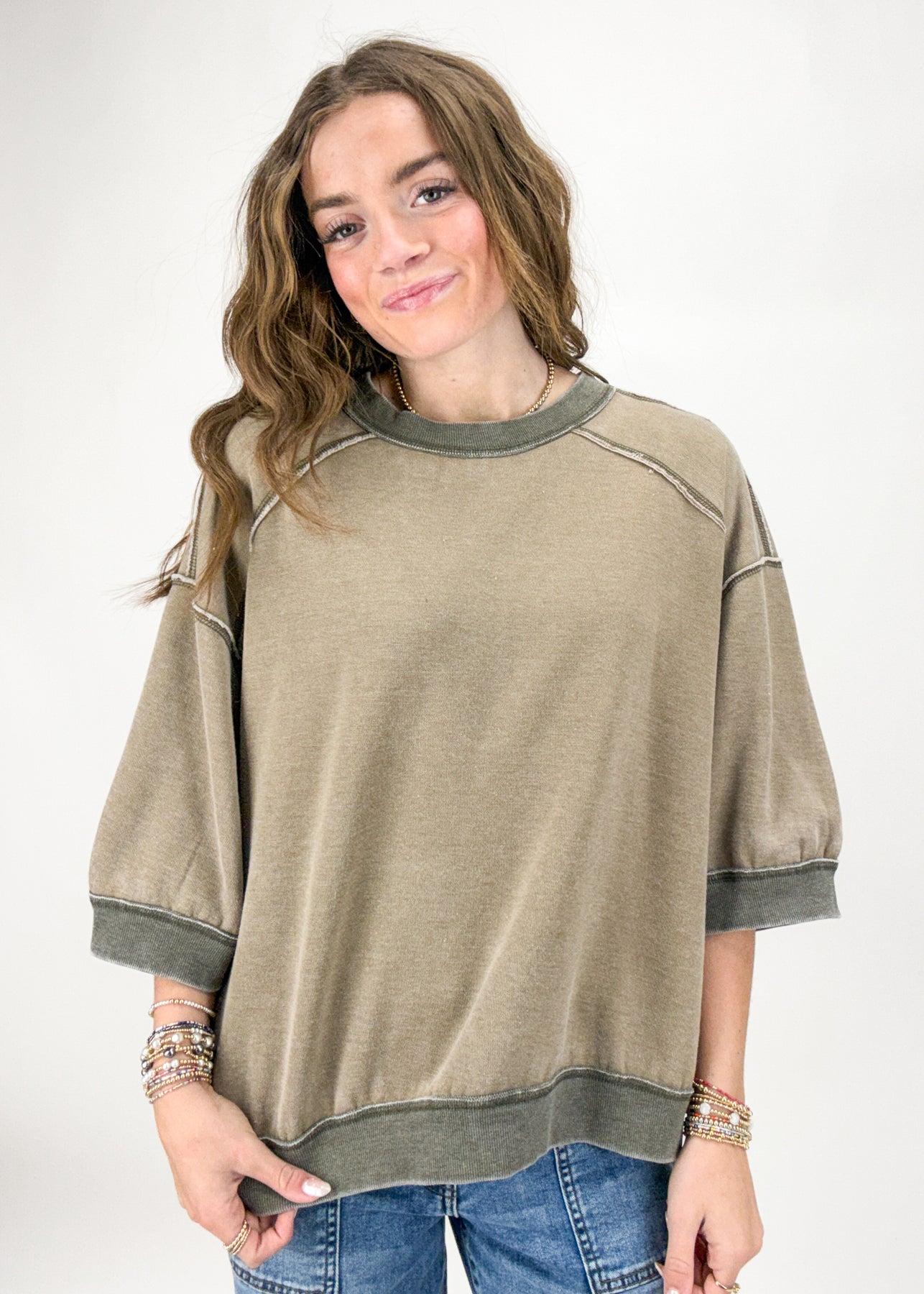Laidback to the max, this effortless pullover from We The Free is featured in a boxy, ¾ sleeve style in a washed fleece fabrication for the perfect lived-in look.