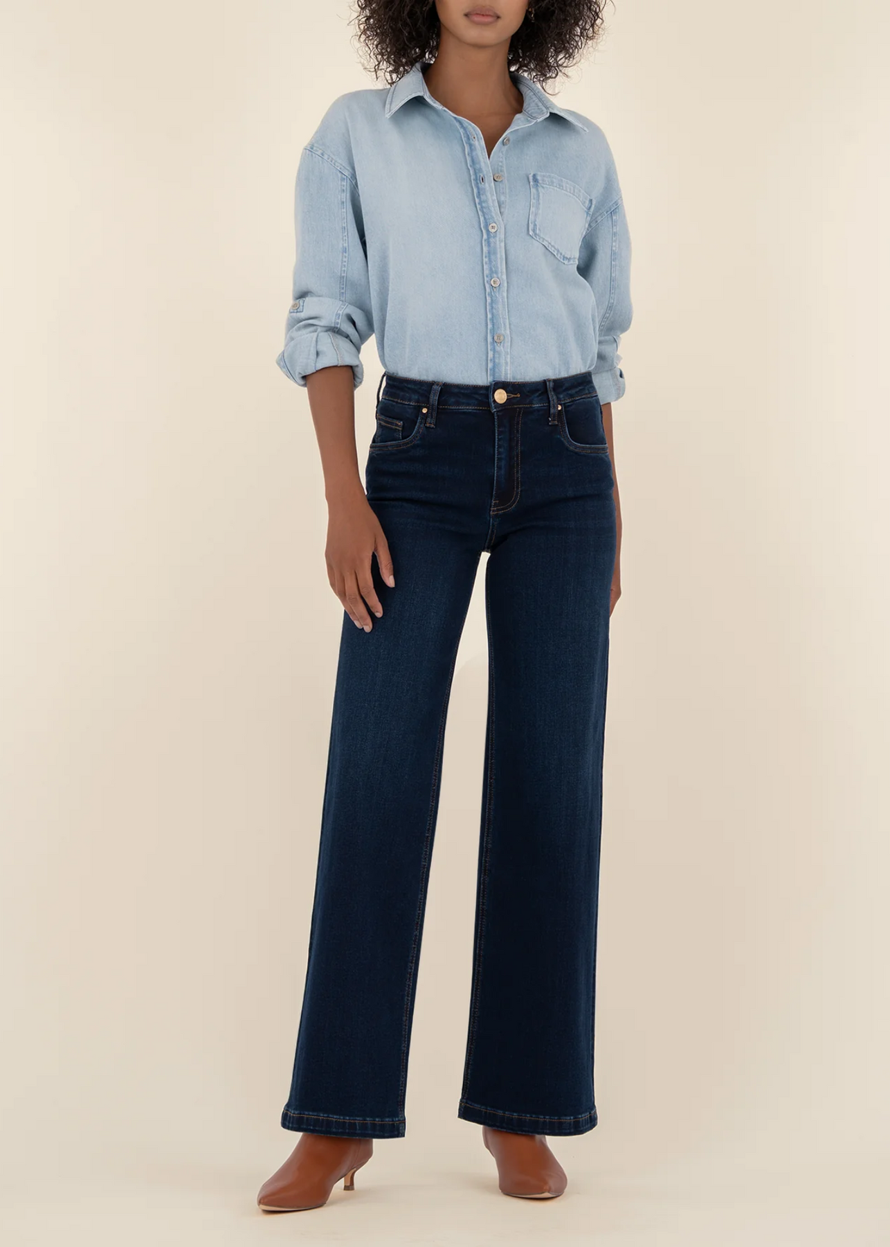 Elevate your denim collection with these high-rise wide leg jeans in a sleek dark wash, made from stretchy material for all-day comfort. Perfect for dressing up or dressing down with effortless style. A versatile essential you’ll reach for again and again.
