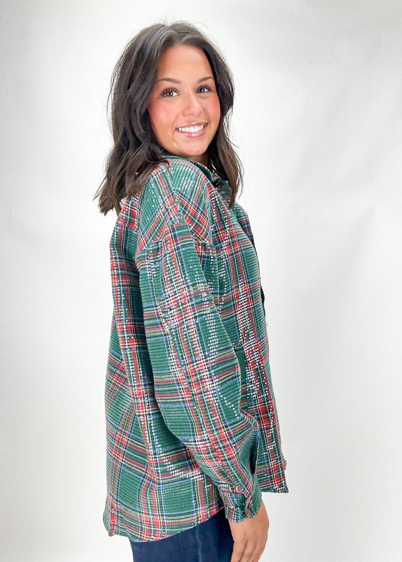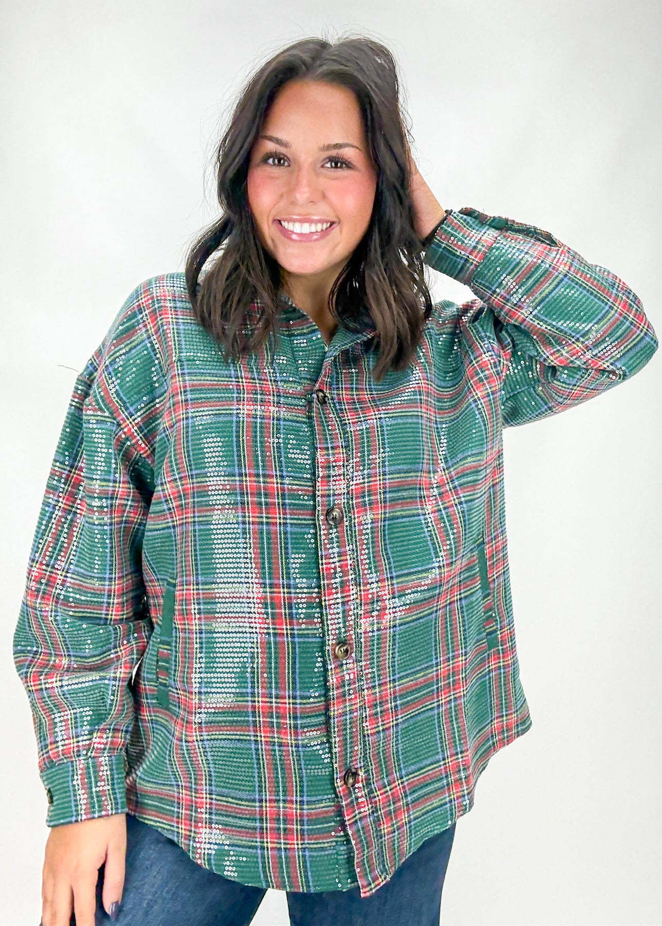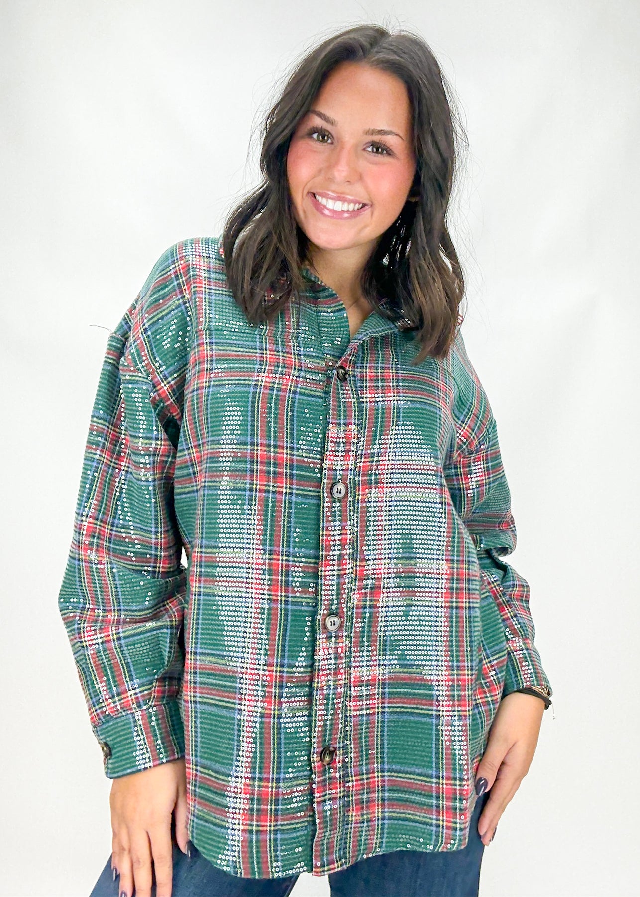 Turn heads at your next holiday party in this subtle statement top! Featuring a muted green plaid with a clear sequin overlay, this button down top is a classic piece with a fun twist!