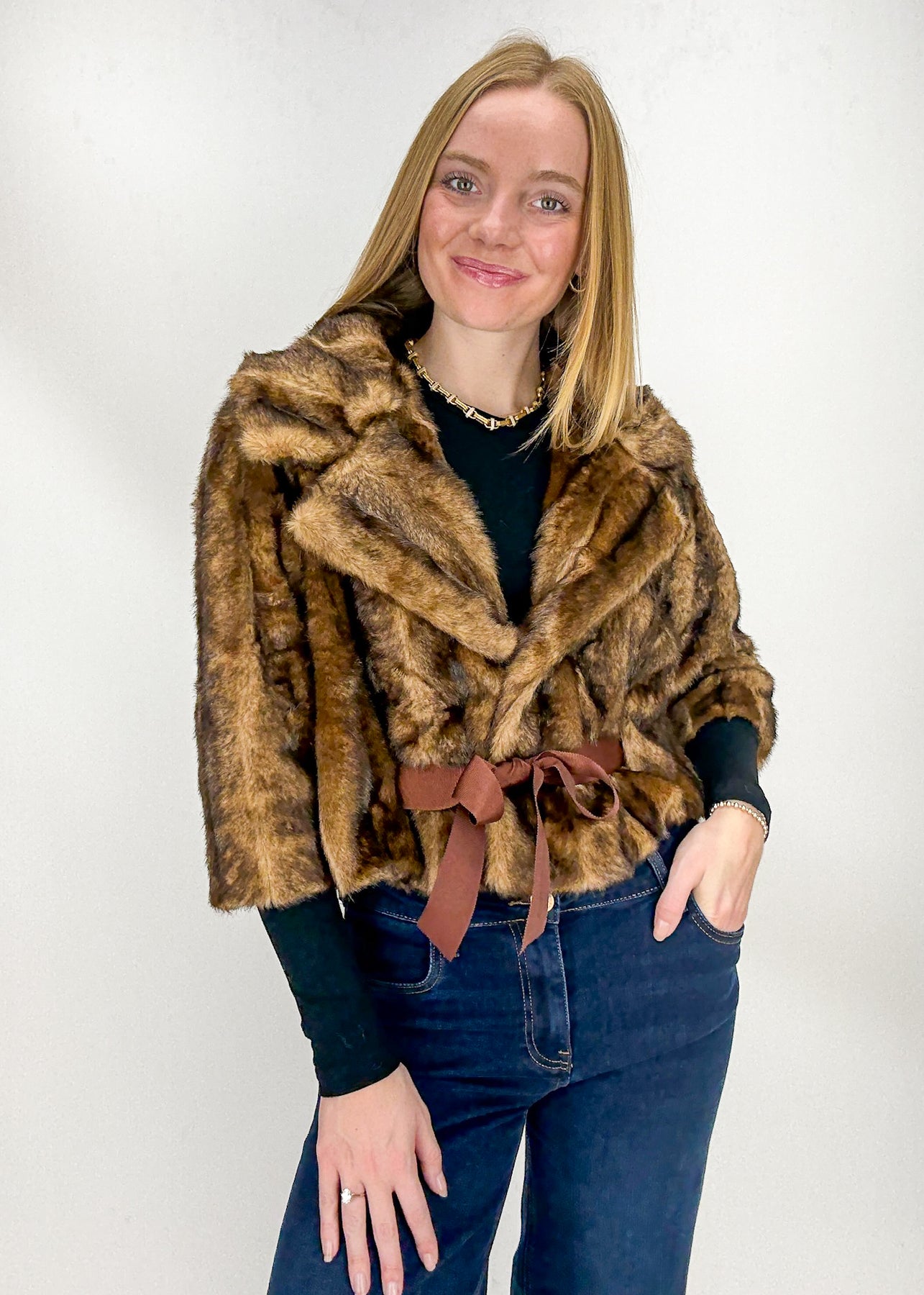 In a vintage brown faux fur that is trendy yet so timeless, this jacket offers a modern twist on a classic! Featuring a large lapel collar, a cropped length, and a black silk ribbon accent, this piece effortlessly blends timeless elegance with modern romance.