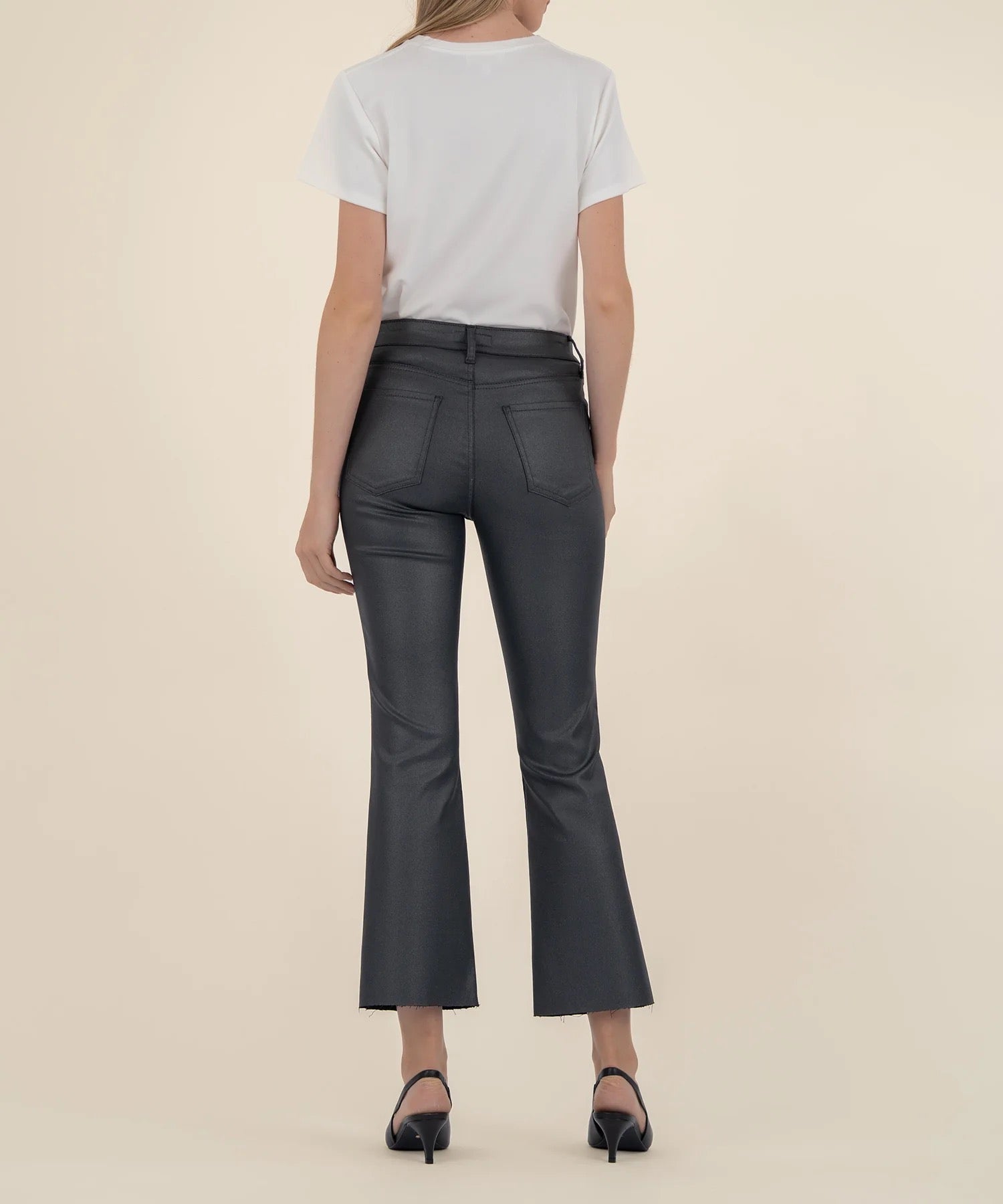 Elevate your denim game with these high-rise ankle flare jeans, designed to flatter your figure while offering a modern twist. Crafted from a sleek coated material, they feature a raw hem for a touch of edge and a chic Silver Bell color that boasts a rich, deep tone. Perfect for dressing up or down, these jeans seamlessly blend bold style with everyday comfort.