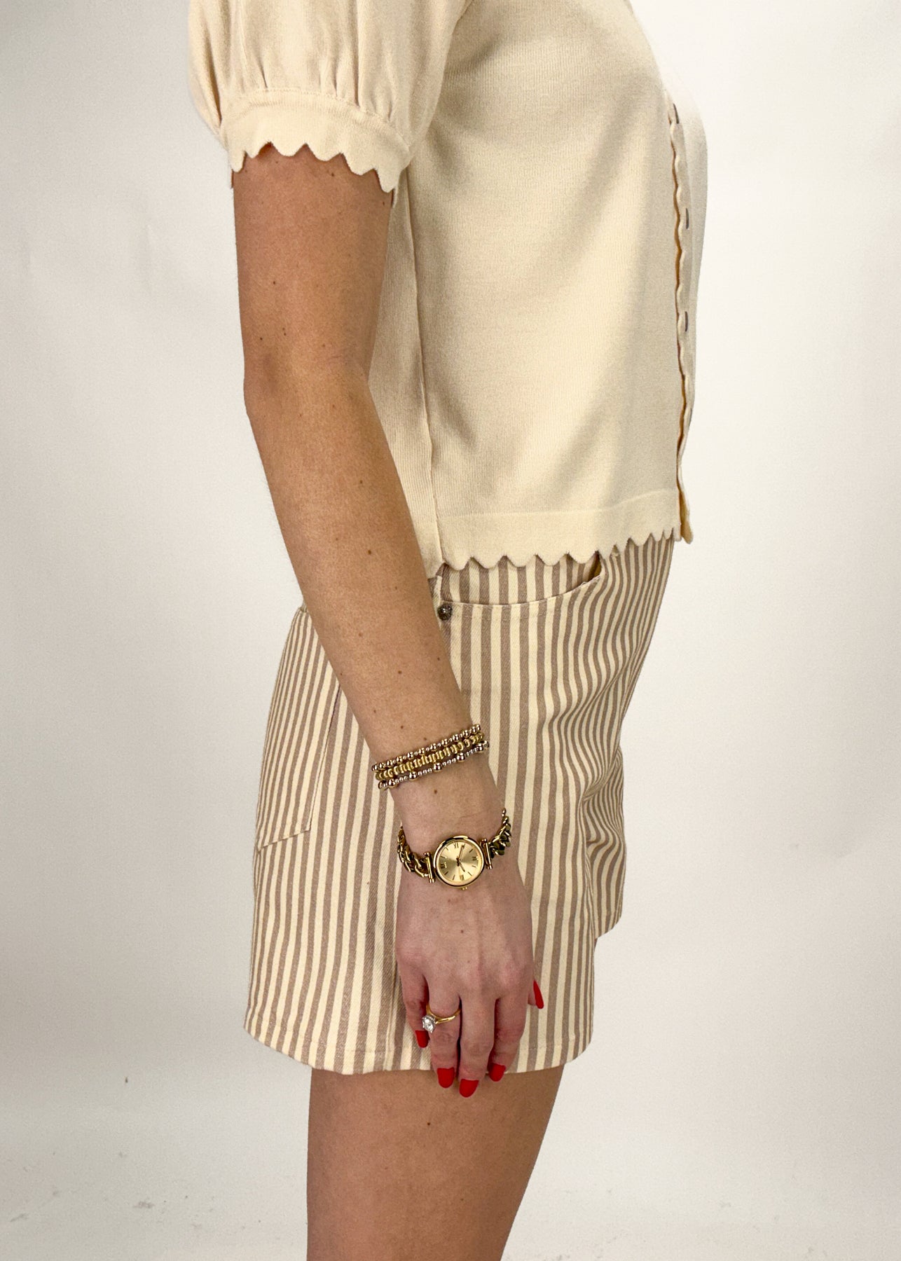 Looking for a neutral yet fun short? Look no further! These shorts come in a tan and brown striped combo that are perfect for styling with a graphic tee or a fun sweater.