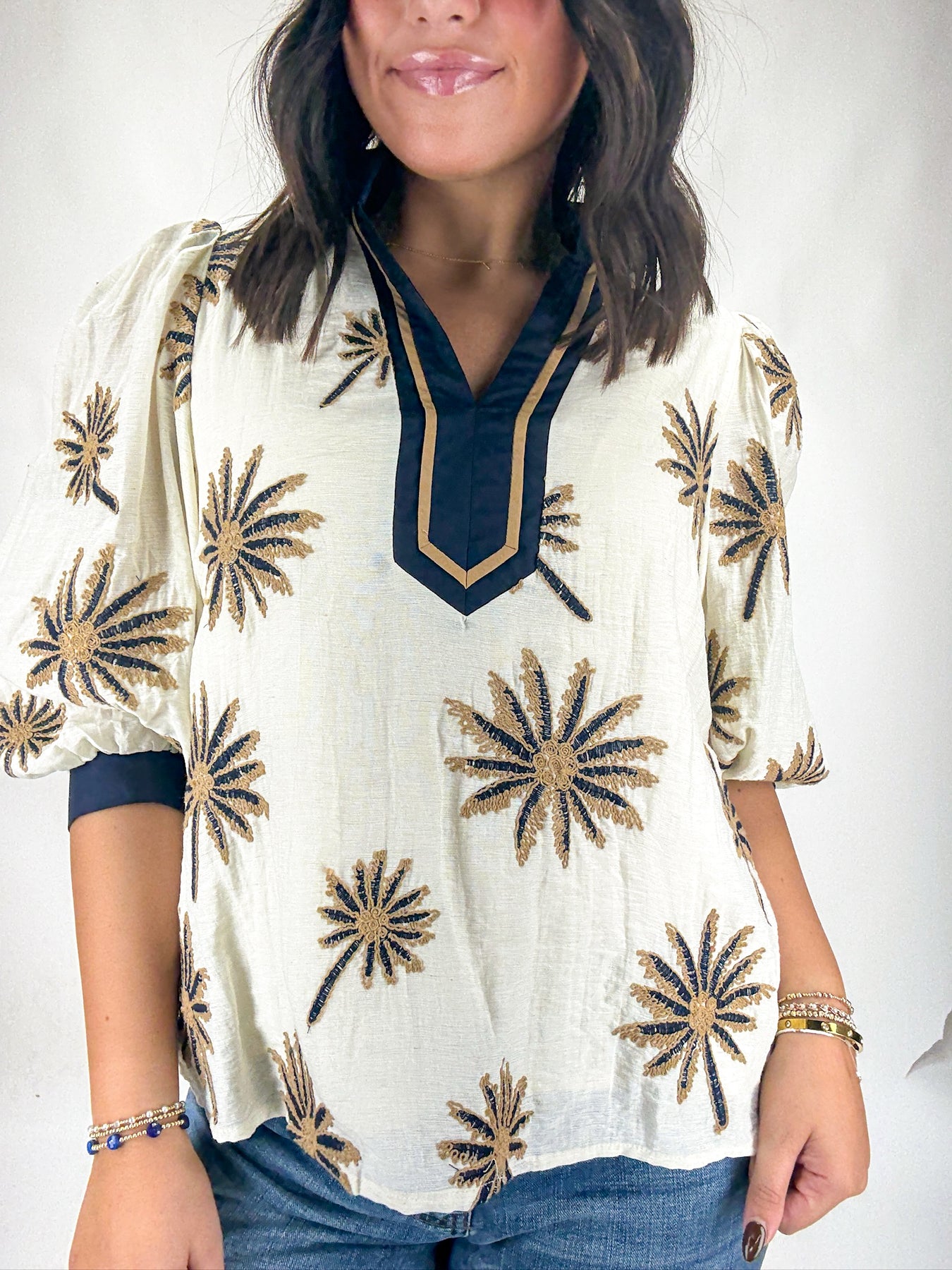 This ecru colored top features navy palm tree patterned embroidery, navy trim, and a v-neckline.