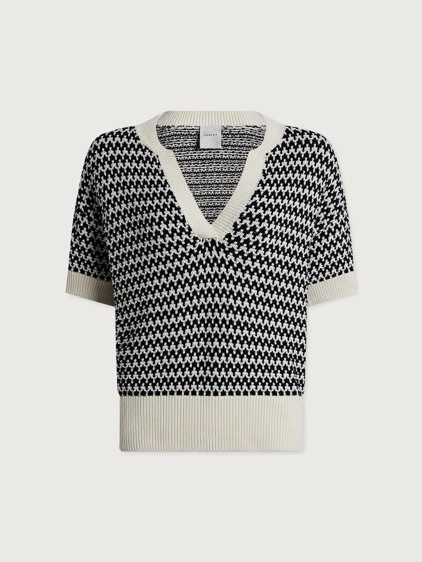 The Dora knit top has a relaxed fit with a drop shoulder and deep V-neckline that takes inspiration from a classic Polo collar. Made from 100% cotton with a textured two-color stitch.