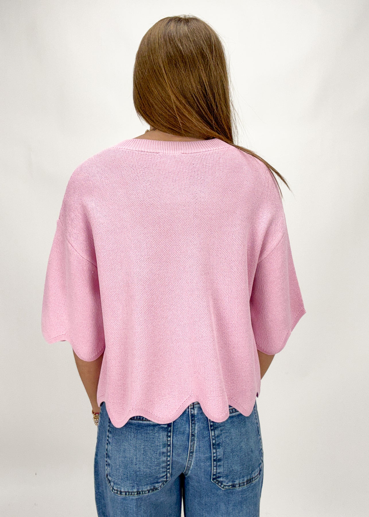 Pretty in pink, this lovely knit top has a scalloped hemline and 3/4 length dolman sleeves that are sure to give your outfit the perfect touch of charm.