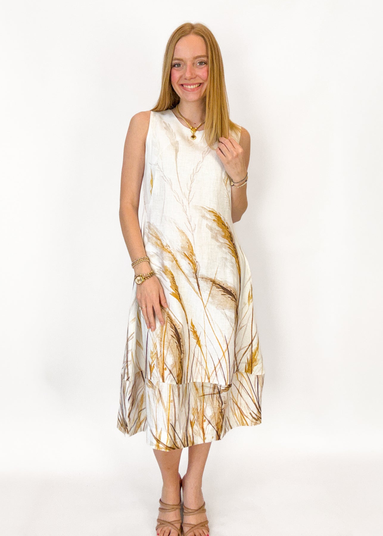 A linen midi dress is a must have for summer outings. This classic white dress features a windswept design that is elegant and sure to turn heads.
