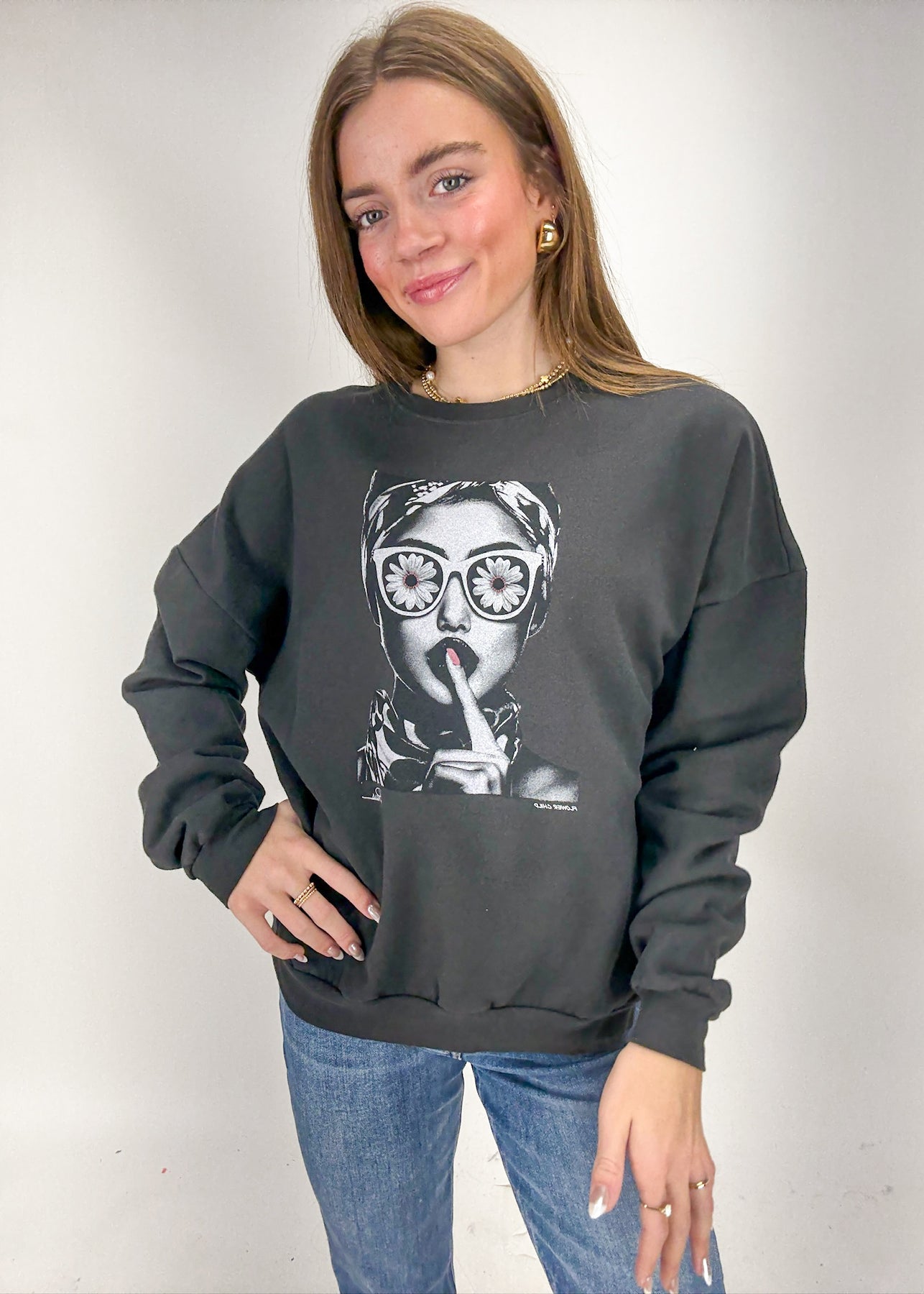 Woman wearing a black sweatshirt with a flower face graphic in front of a grey background