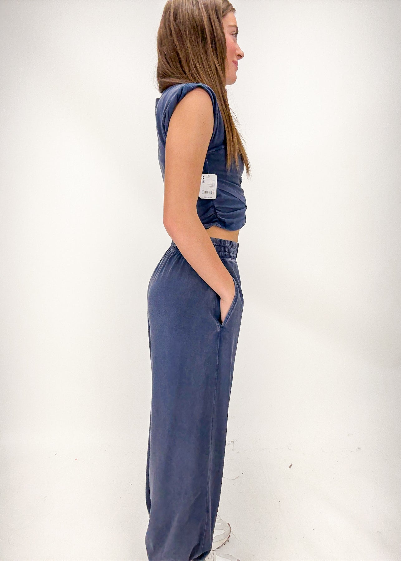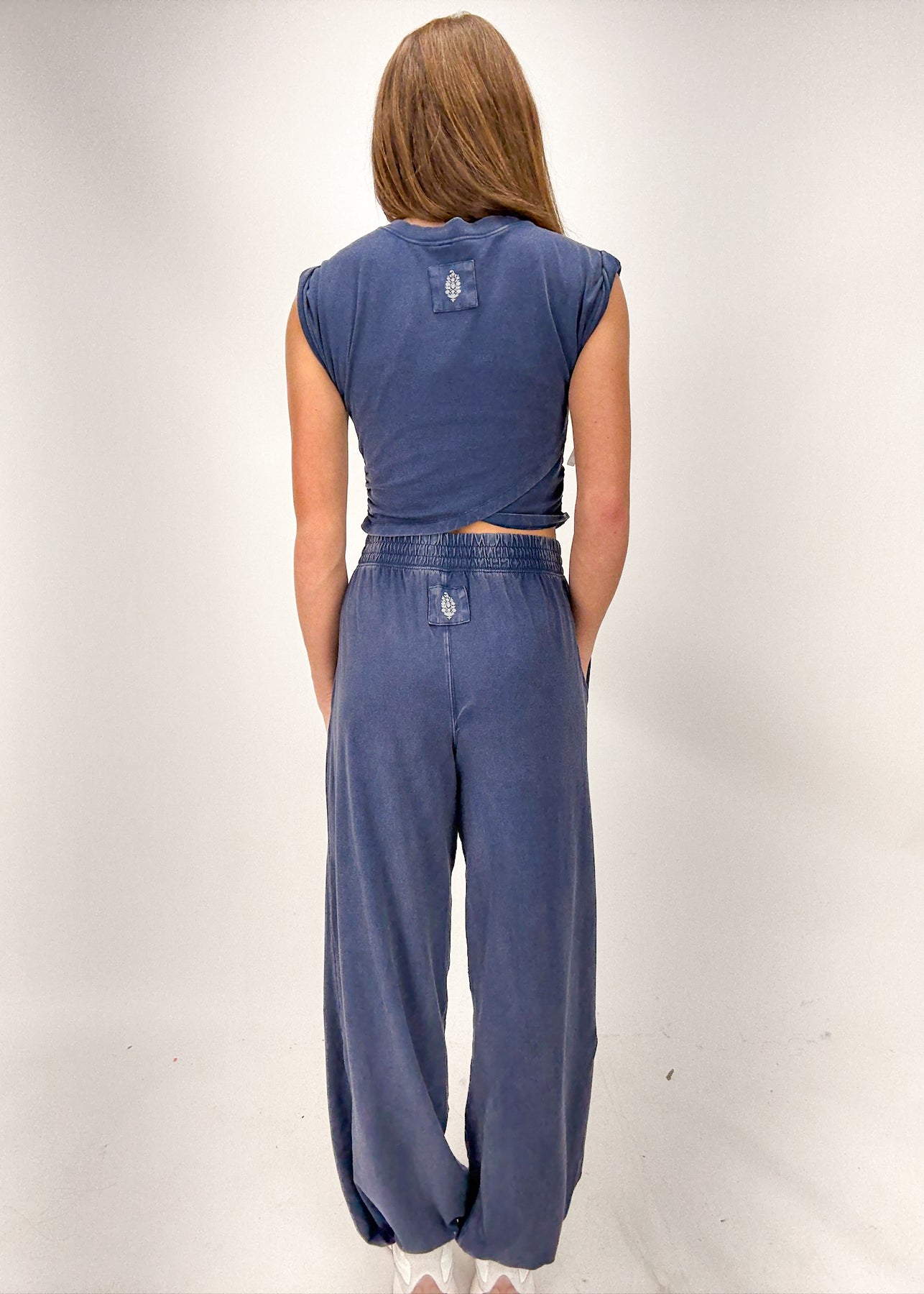 Features: Soft, jersey fabrication; relaxed fit; cropped muscle tee top with seaming detail; ankle length pant with high-rise waist and wide leg; elasticated waistband and cuffs; crossover detail on top; ribbed collar; side seam pockets