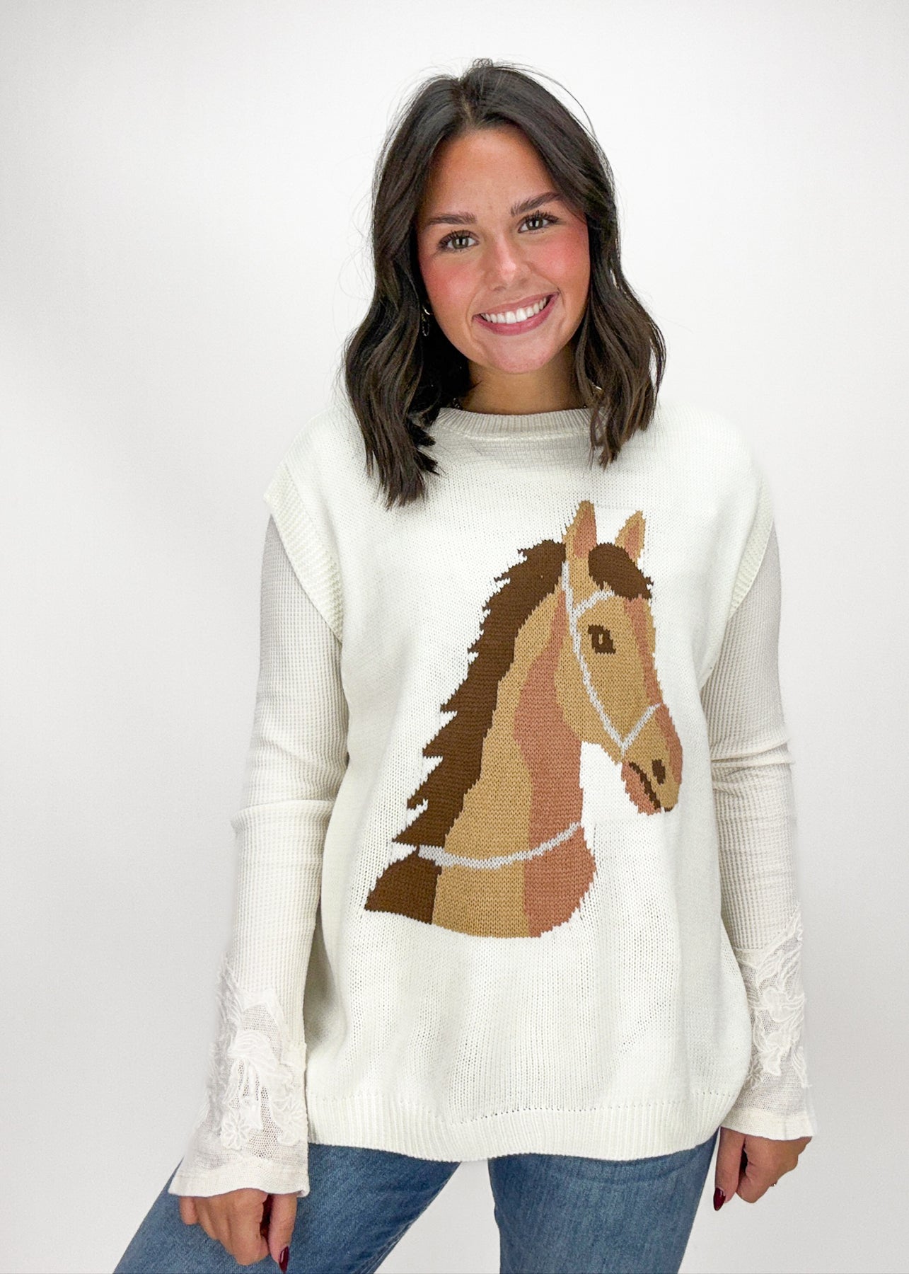 Show your style with this trendy horse graphic top. In a cozy knit with short sleeves, this piece is great styled with jeans or a patterned skirt for that western-chic look!