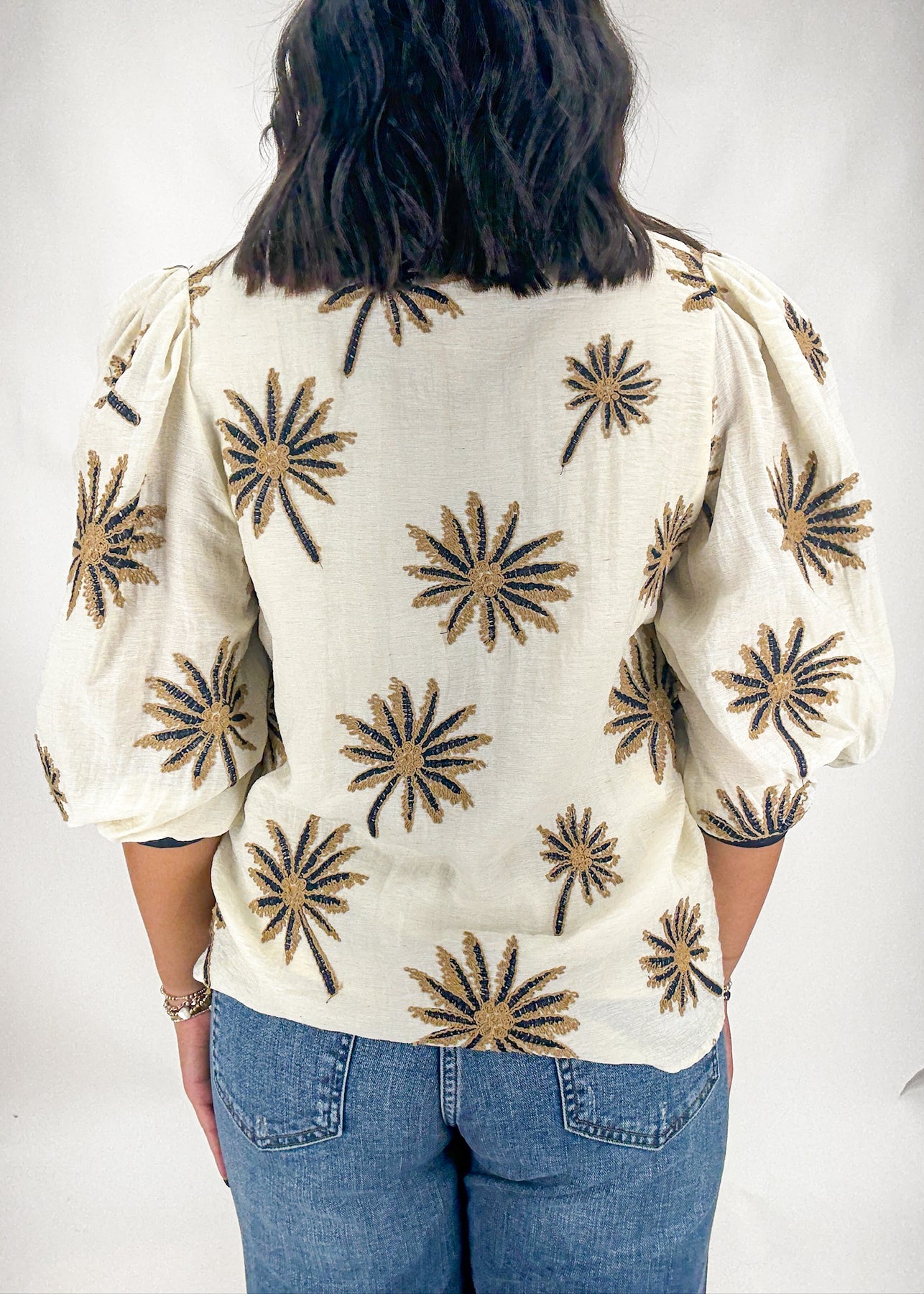 This ecru colored top features navy palm tree patterned embroidery, navy trim, and a v-neckline.