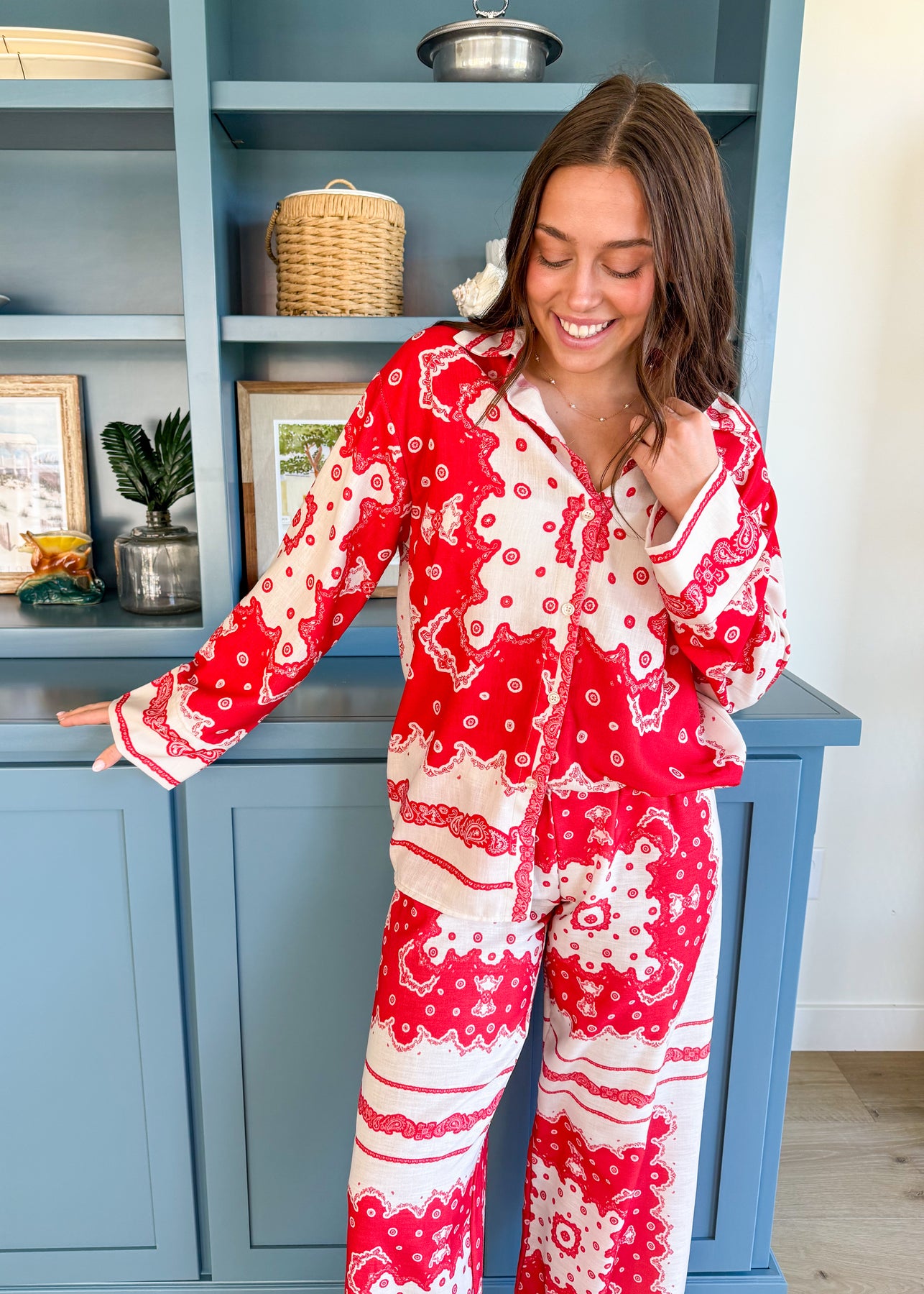 Turn heads with these bold statement pants. In a classic wide leg style, these comfy bottoms feature a red bandana print that is sure to add some personality to your look.