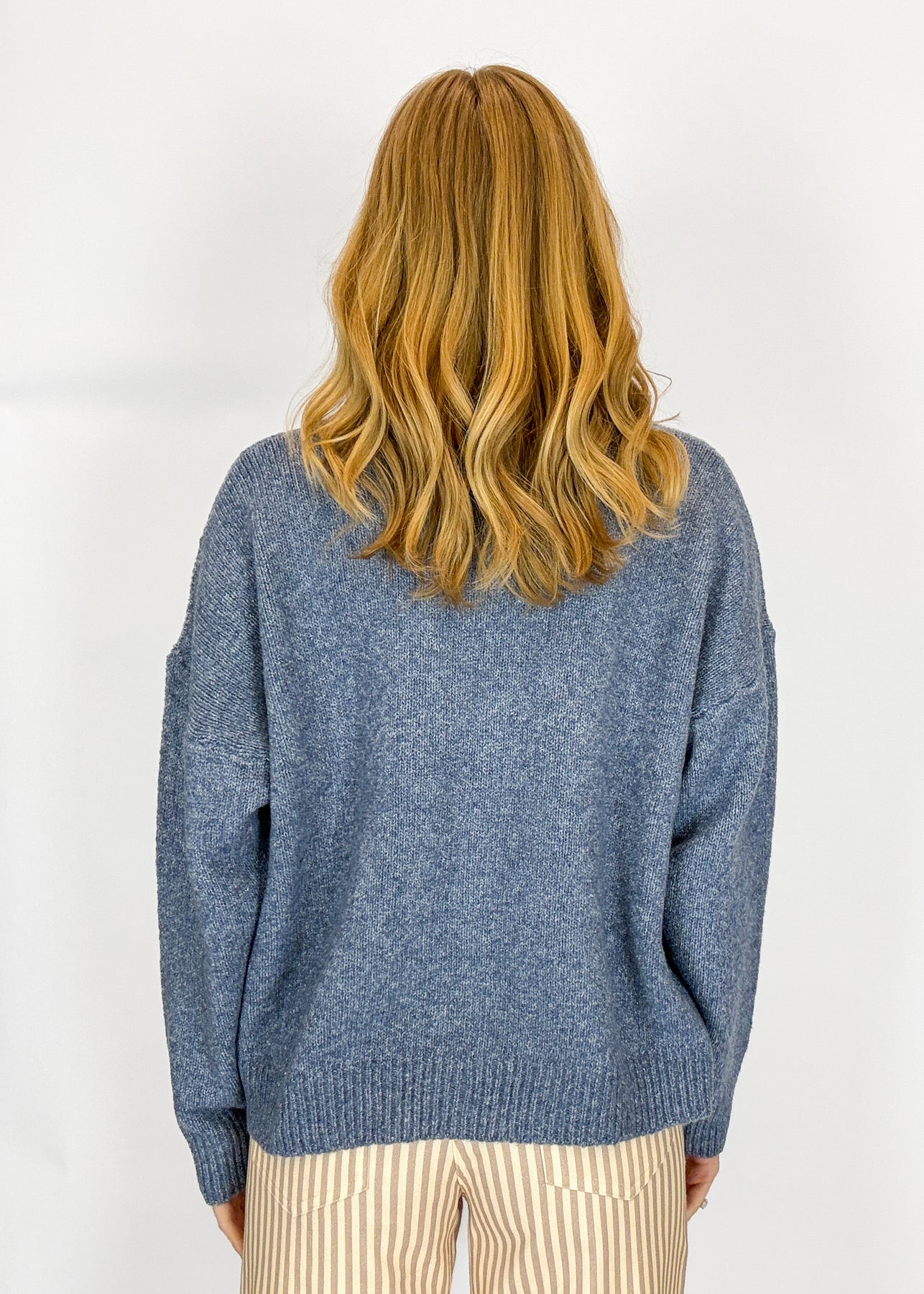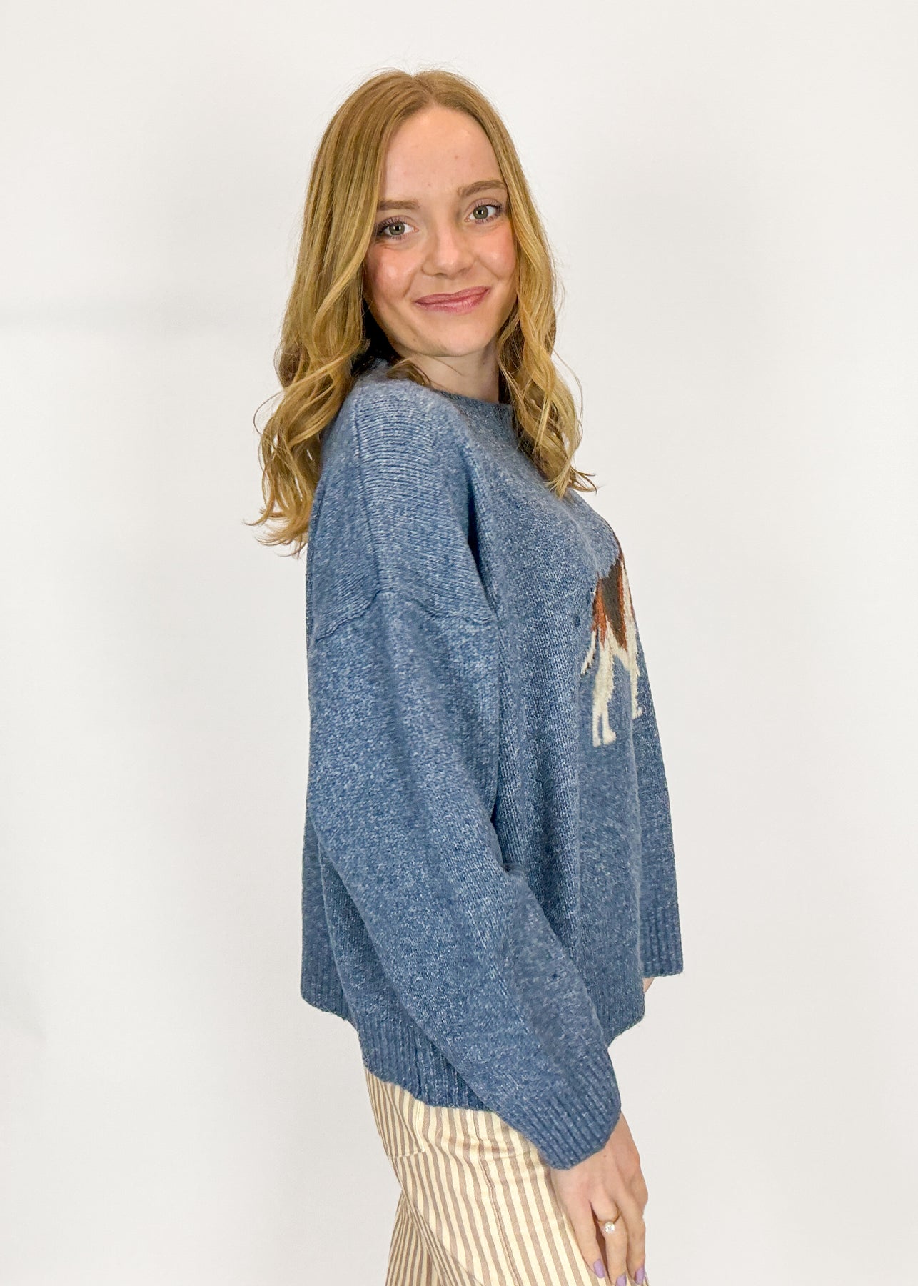 Your new go-to sweater has arrived! This lightweight knit comes in an antique blue color and features a dog graphic for a truly unforgettable look.