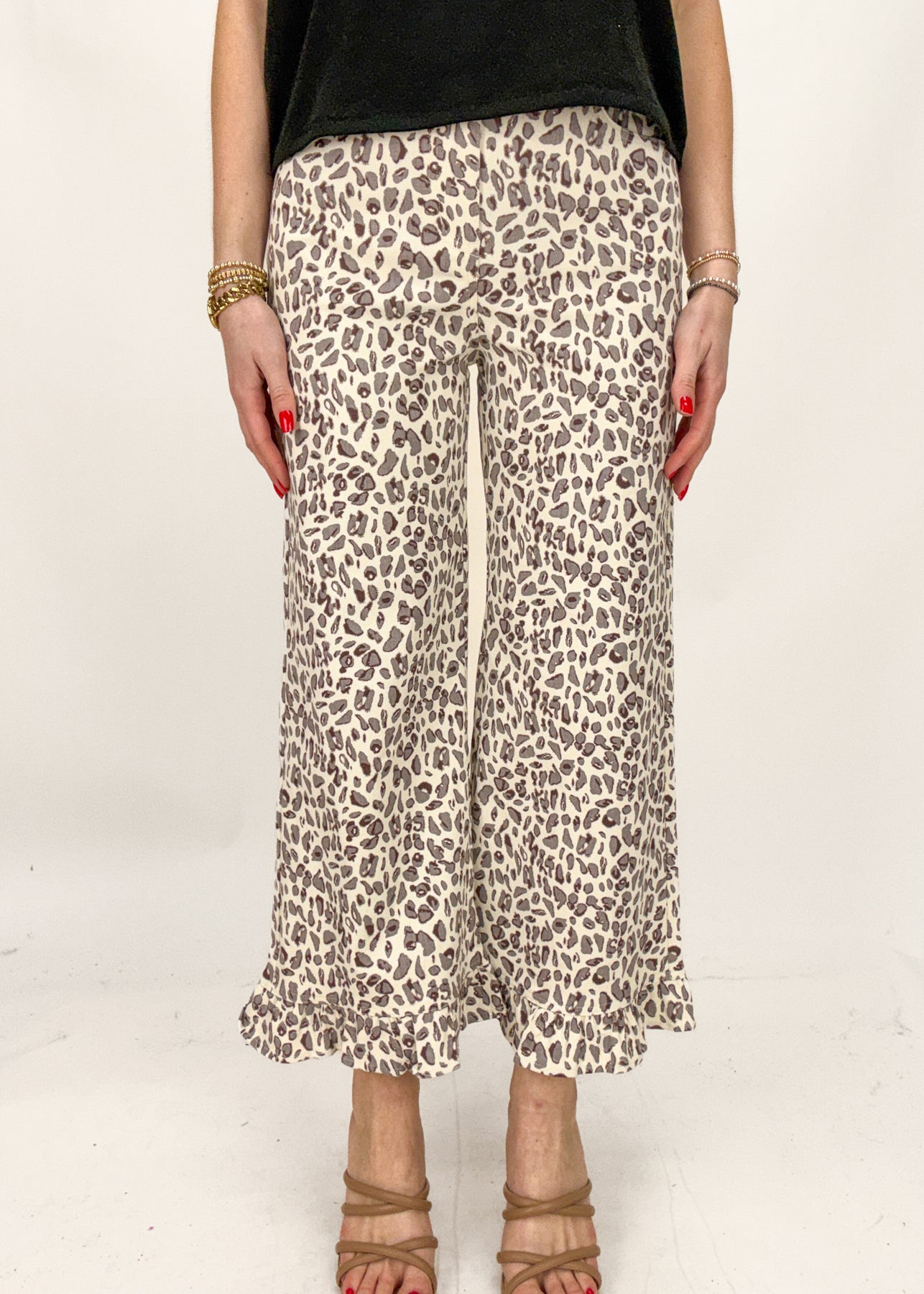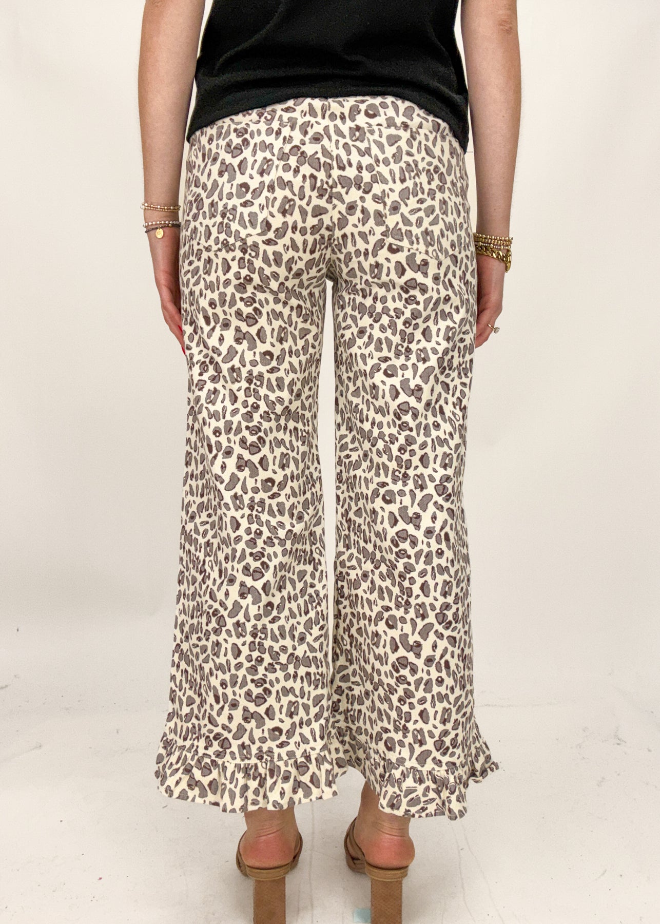 Trendy yet so unique, these wide leg pants feature a bright leopard print and a ruffle hem for an added touch of character. Style them with a graphic tee or a fun button down for a lovely spring and summer look.