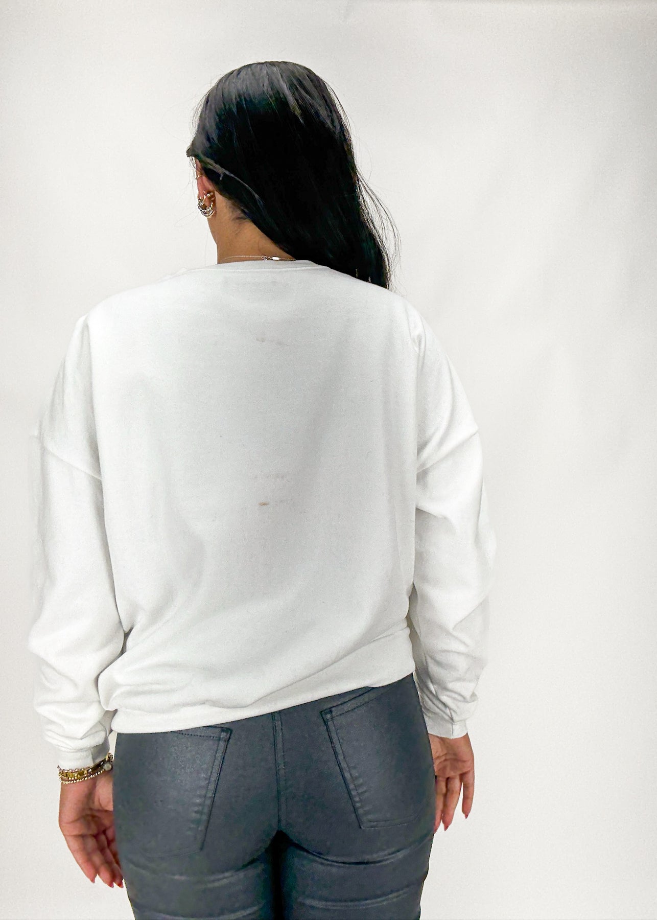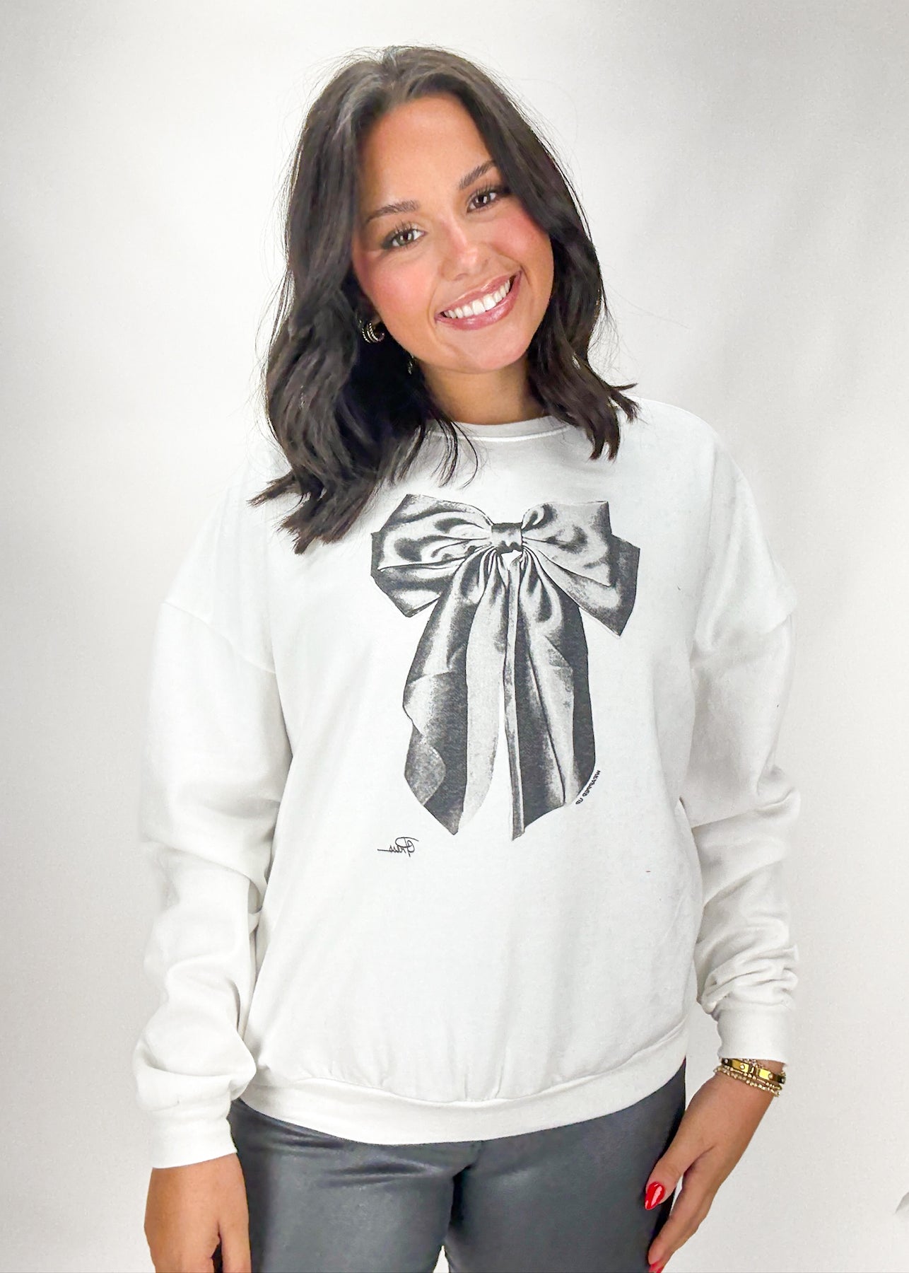 Woman wearing a white sweatshirt with a black bow design on a plain background