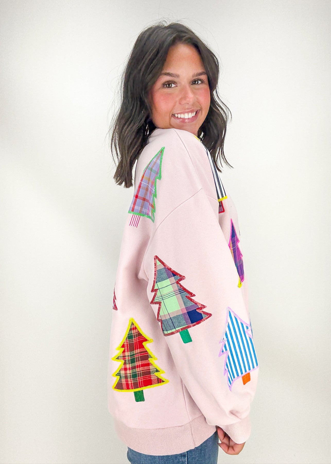 This cozy, light pink sweatshirt features plaid and stripe Christmas trees. Whether you're headed to a holiday party or staying cozy on the couch, this piece is just what your closet has been looking for!