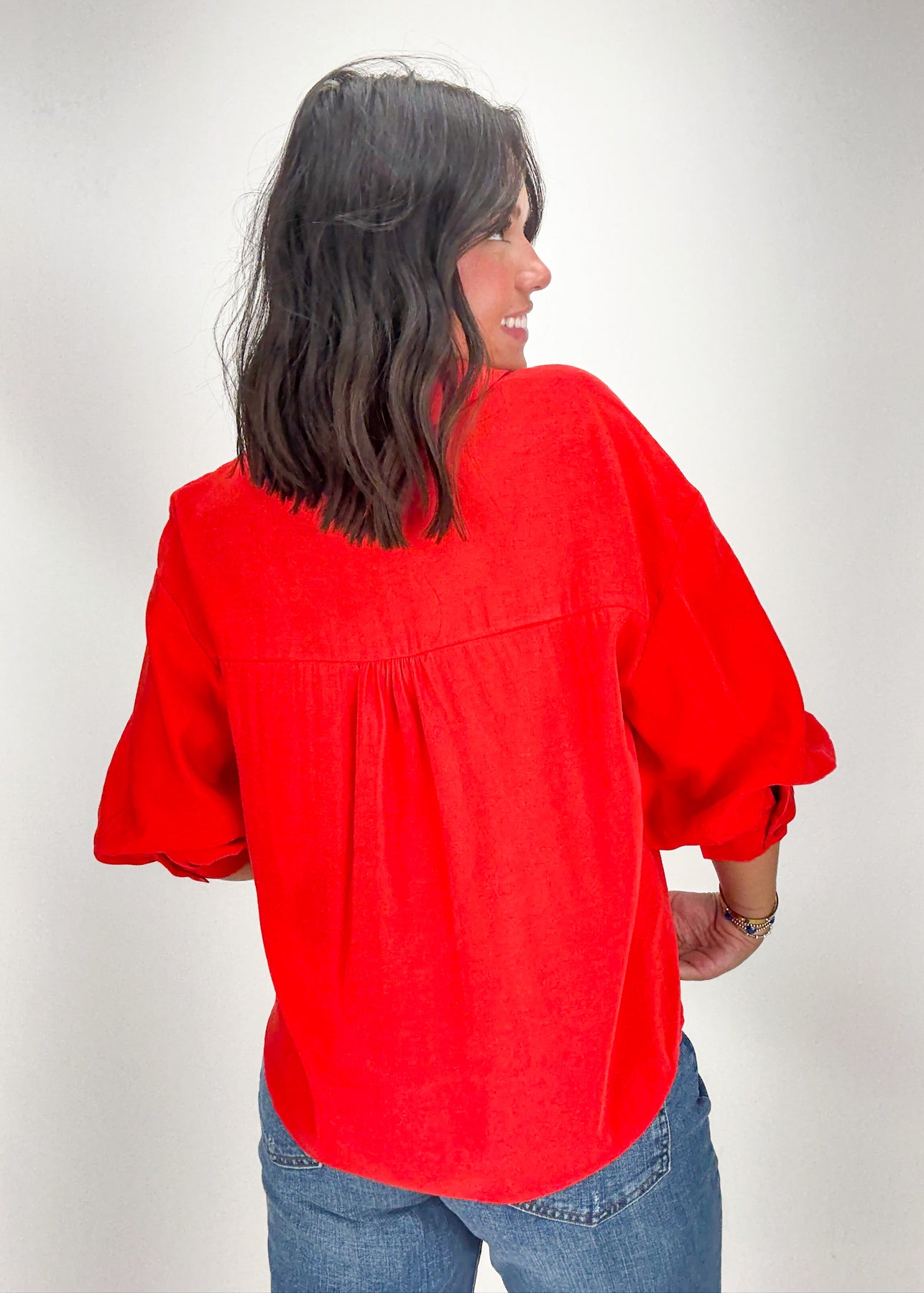 Elevate your wardrobe with this button down top that's anything but basic. In a bold red with 3/4 length puff sleeves and a collared neckline, this top is so versatile for fall and winter styling.