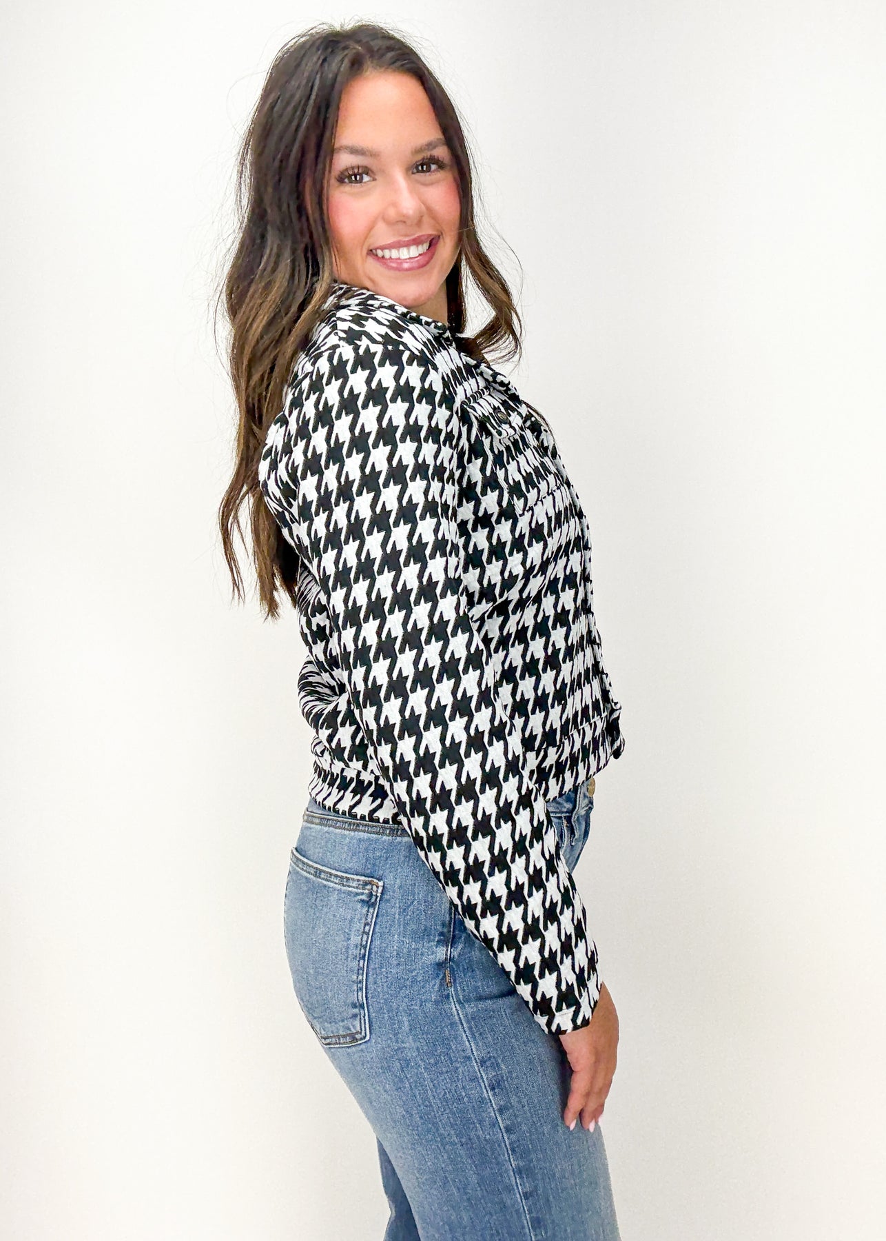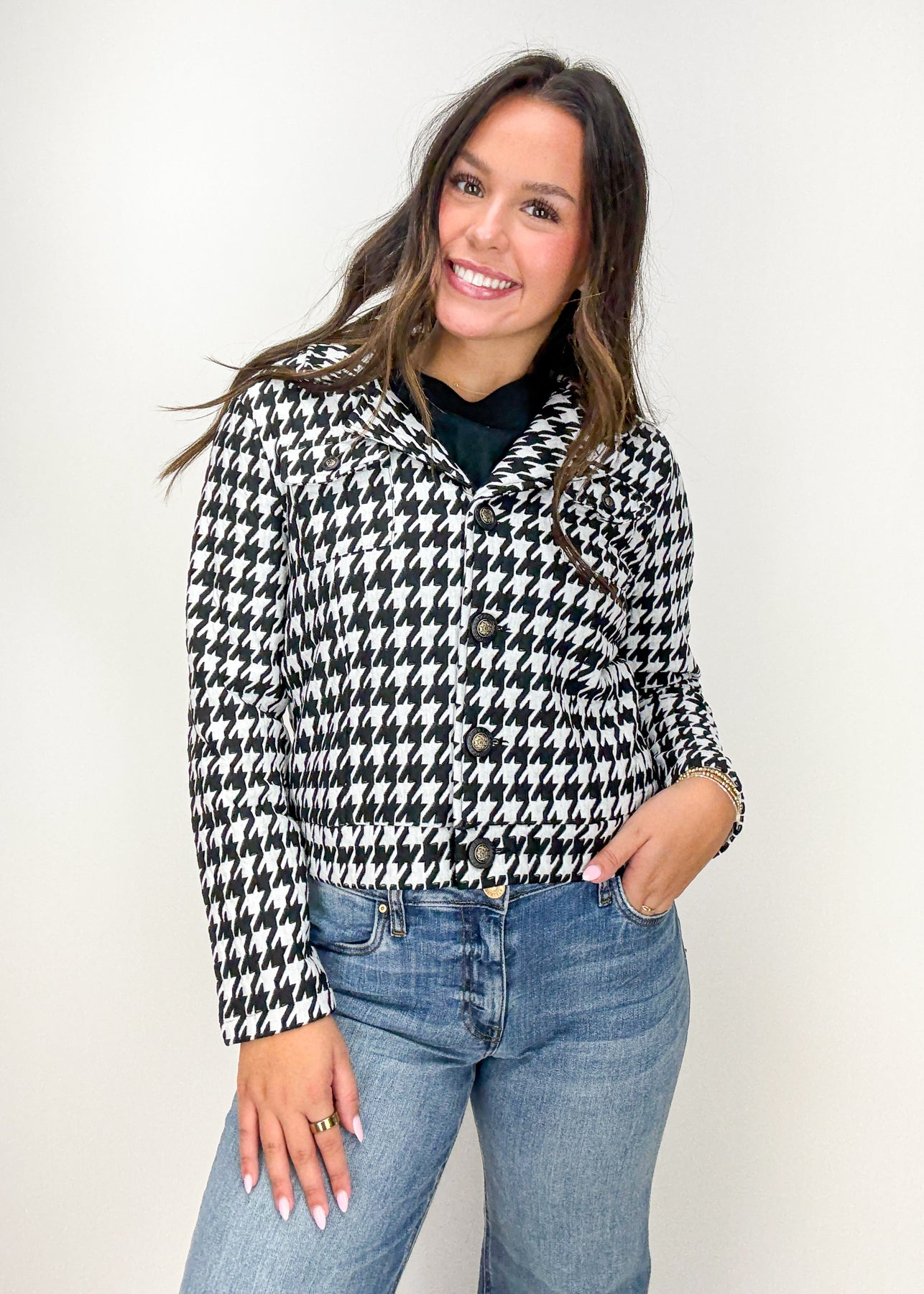 Turn heads in this iconic houndstooth jacket from Dolcezza. With a bold collared neckline and gold button details, this piece is sure to make a statement.