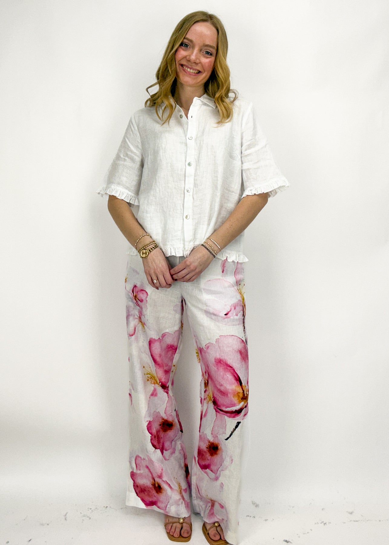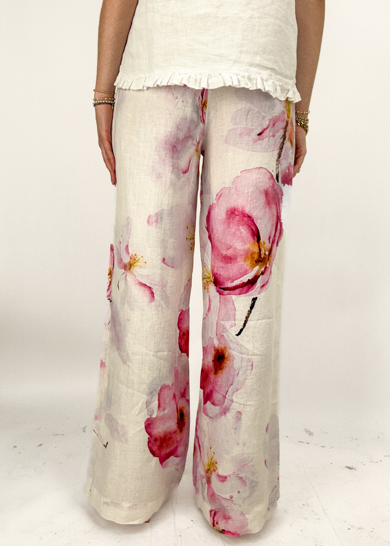 Make a statement with these bold wide leg pants! In a classic white linen and with a large floral design, these bottoms are perfect for spring and summer styling.