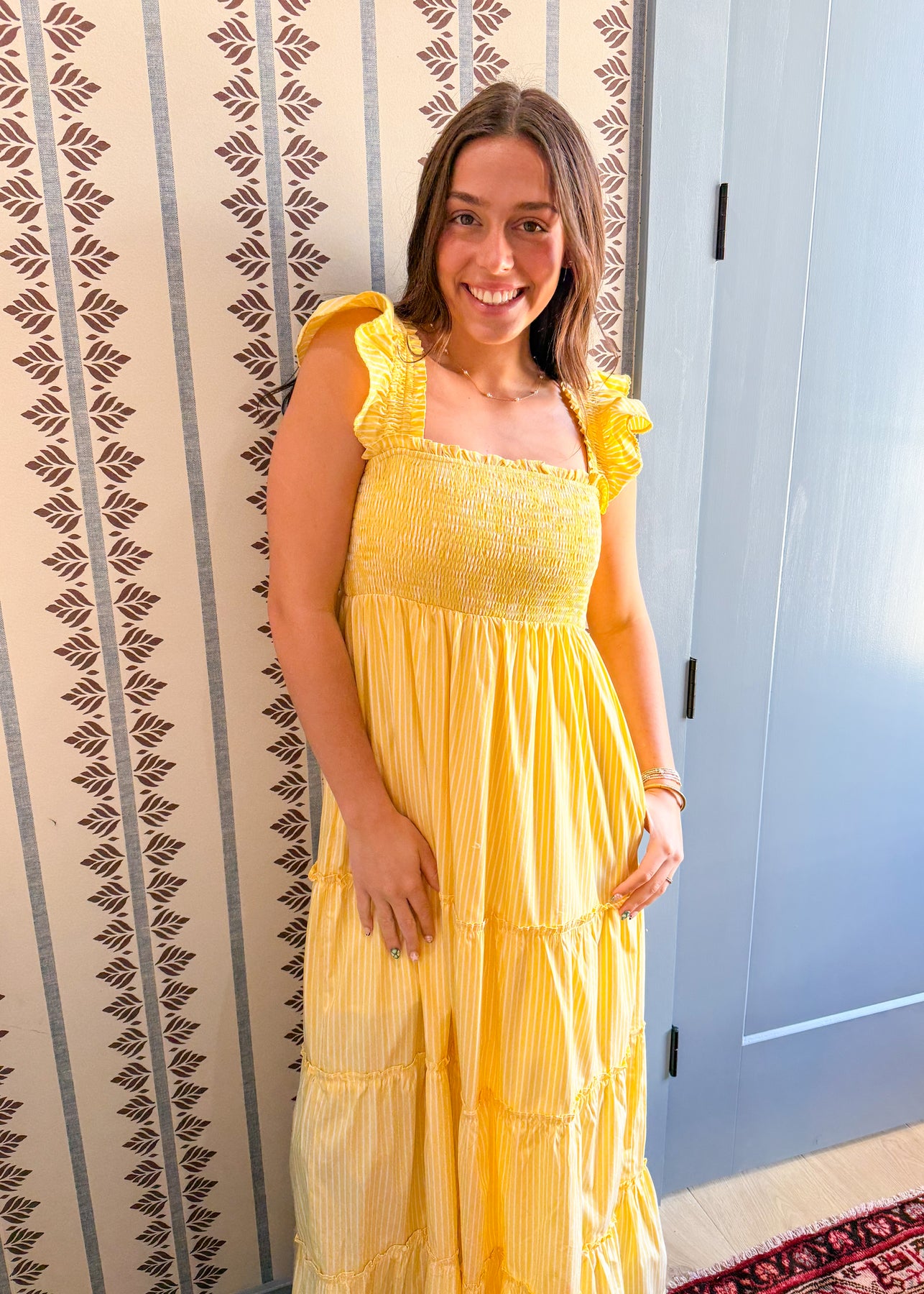 This yellow maxi dress features short flutter sleeves and a square neckline for a fresh look.