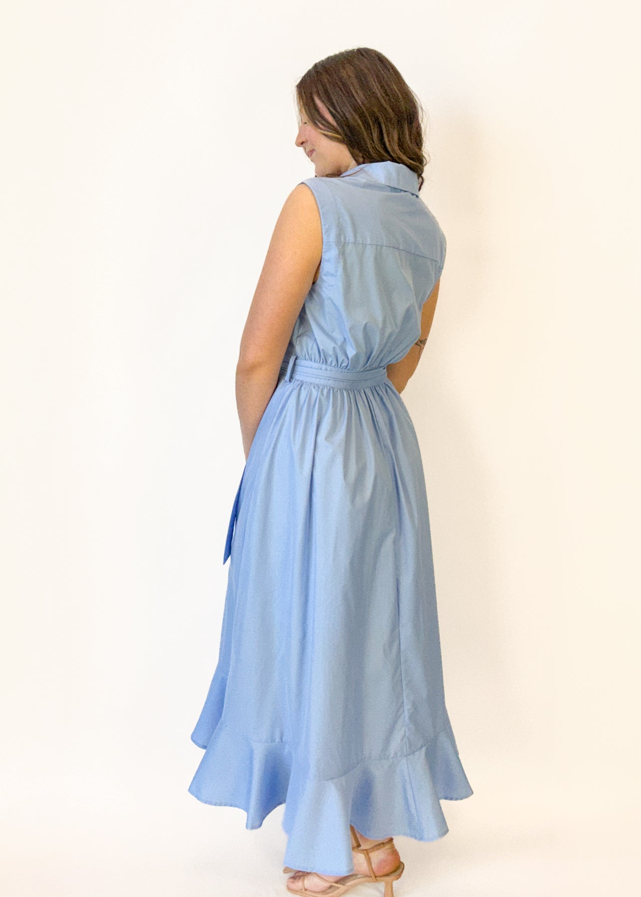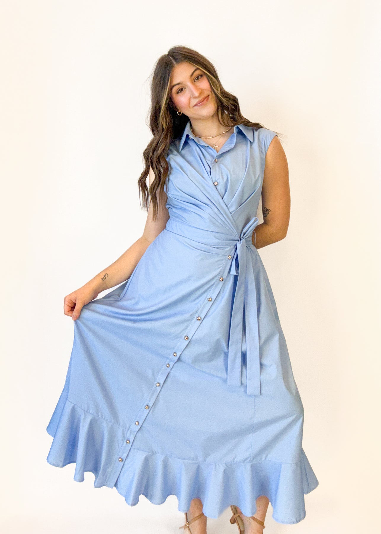 Chic and so feminine, this chambray dress offers an unforgettable look with its gold button design and collared neckline.