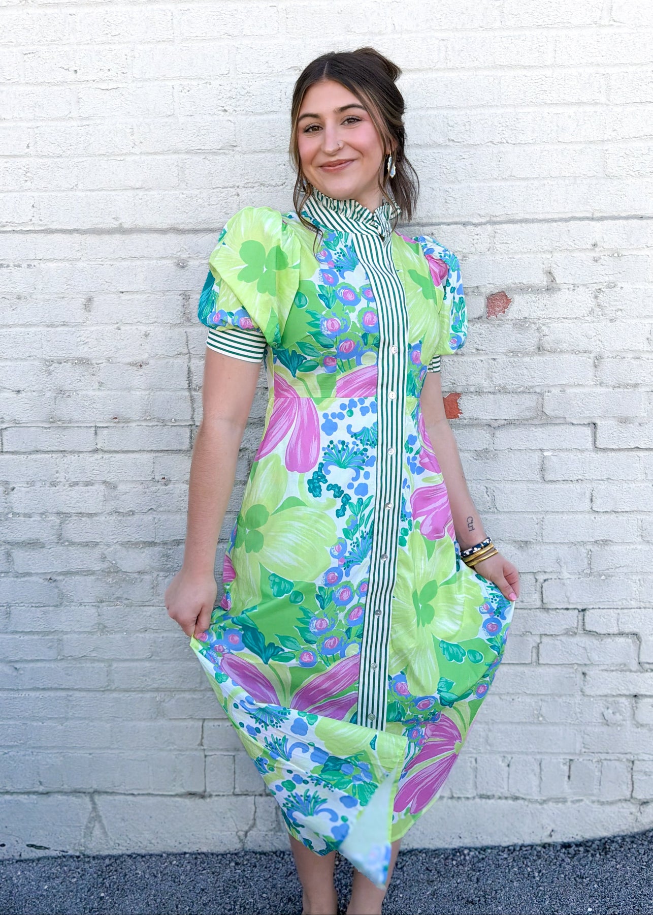 In a vibrant green color combo, this maxi dress features a beautiful floral print, puff sleeves, and a green and cream striped trim! Bridal shower, Easter service, you name it! This dress is perfect for any occasion.