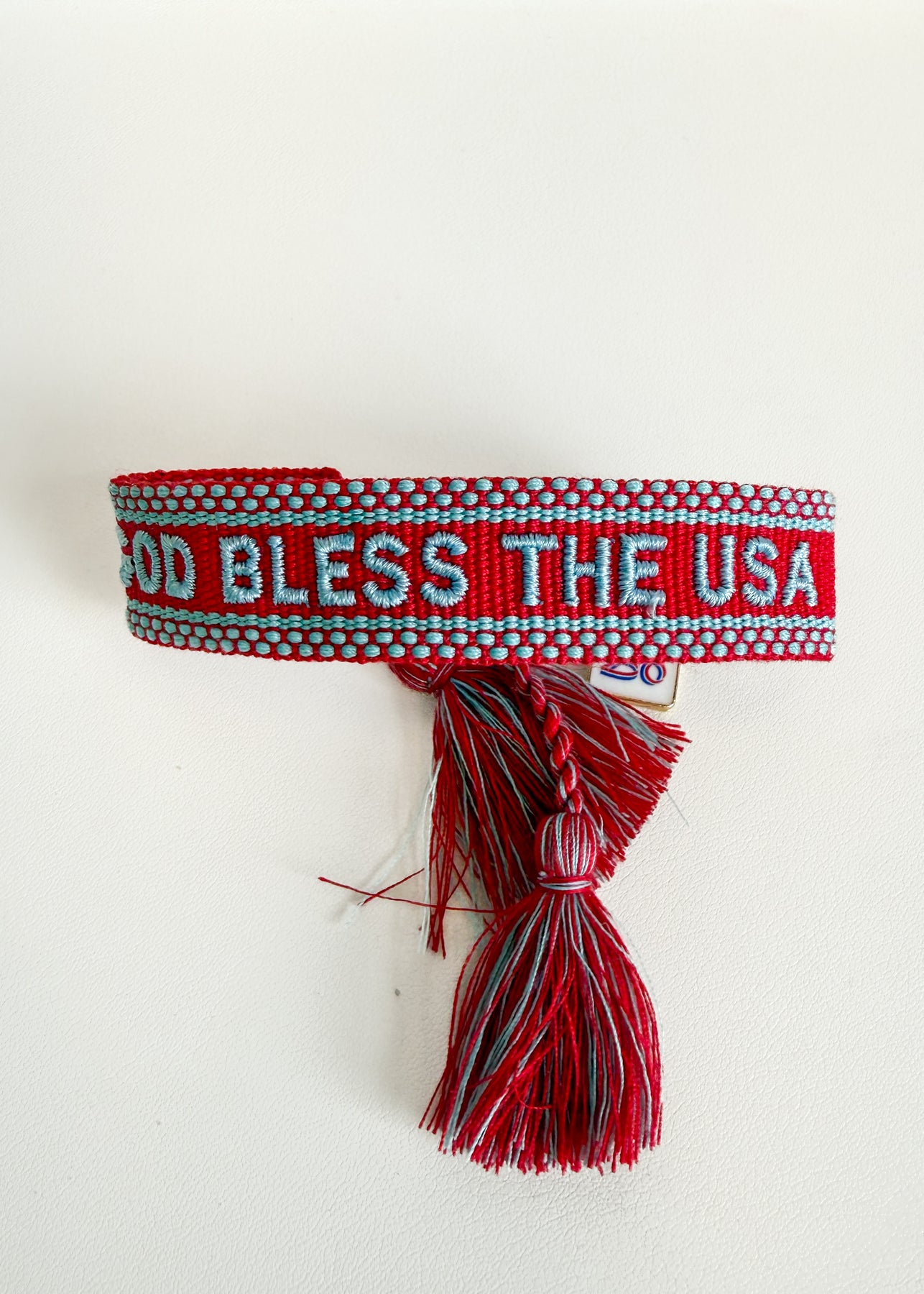 Celebrate in style with this fun "God Bless the USA" canvas bracelet! With an adjustable clasp and fringe details, this bracelet is a bold red accessory that is perfect for pulling together your patriotic look. Whether you're looking for the perfect piece of jewelry for your Memorial Day and Fourth of July outfits, or if you just love all things red, white, and blue, this piece is for you!