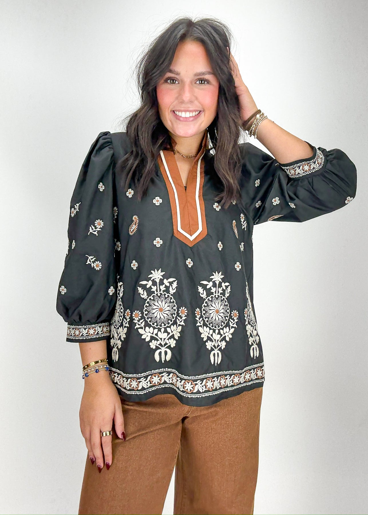 Take on Fall in style in this embroidered statement top! This black top features white floral embroidery, a brown contrast v-neck, and 3/4 length puff sleeves.