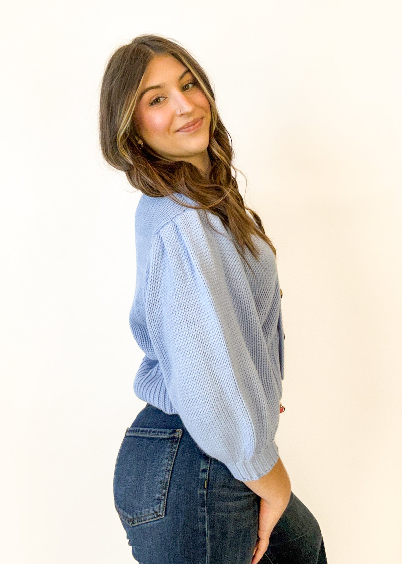 Add a pop of pastel to your spring and summer wardrobe with this cozy, blue button front sweater with short sleeves. Whether you're styling it with white pants or wearing it open for a layered look, you're sure to love this piece.