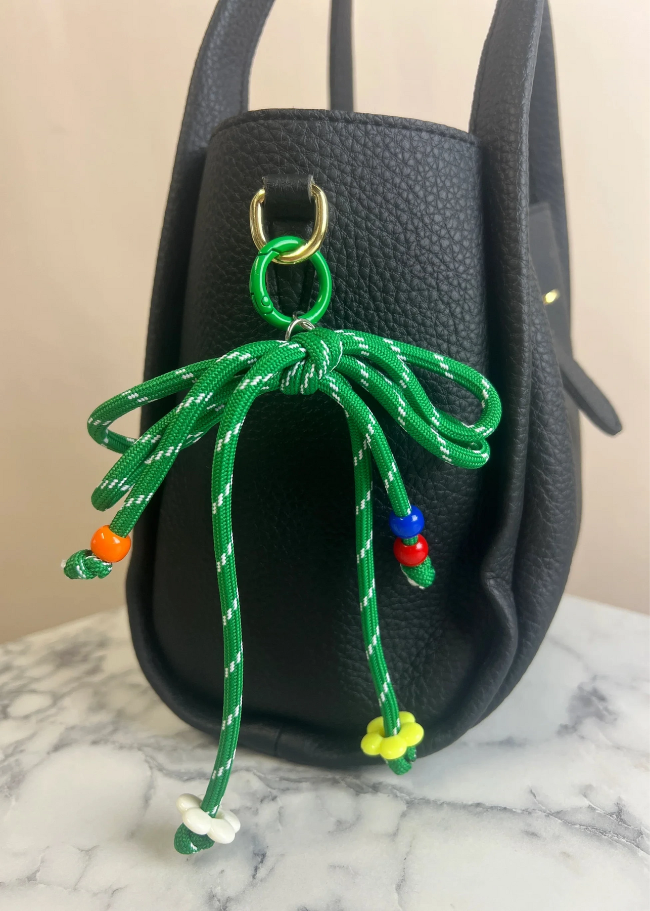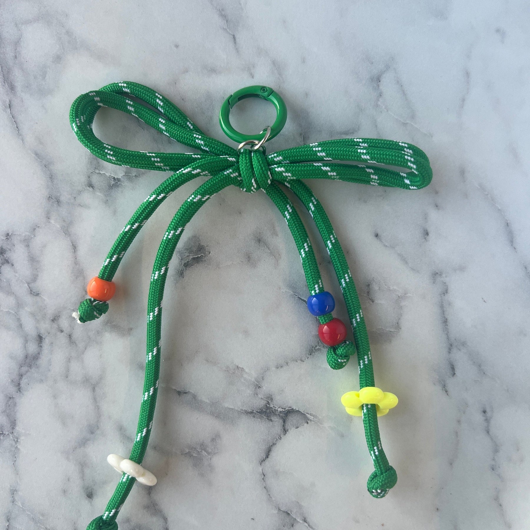 Add a pop of pink to your favorite bag with the Mariner Bow Bag Charm! Made of a green nautical rope with bold bead accents, this charm is the perfect accessory for spring!