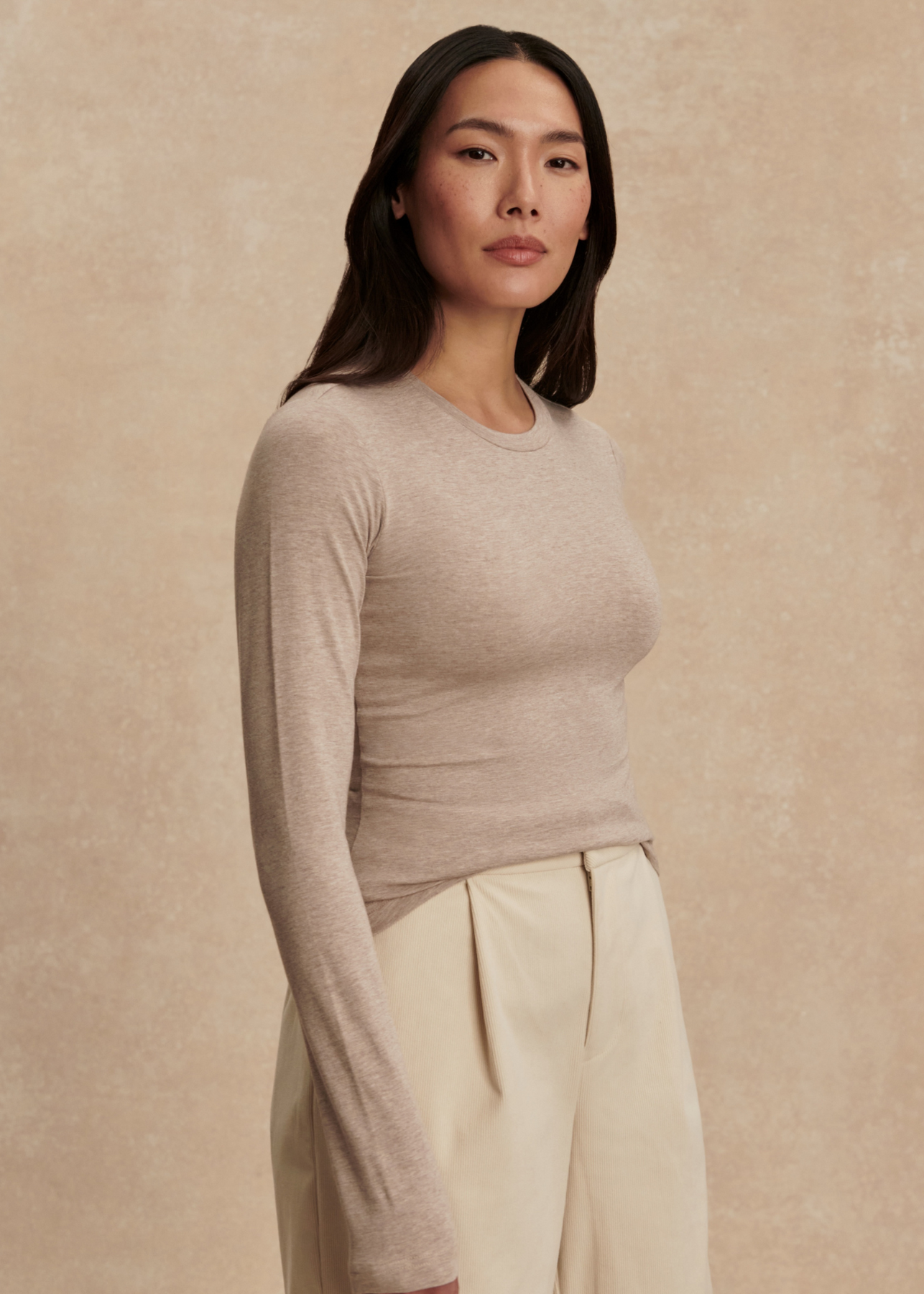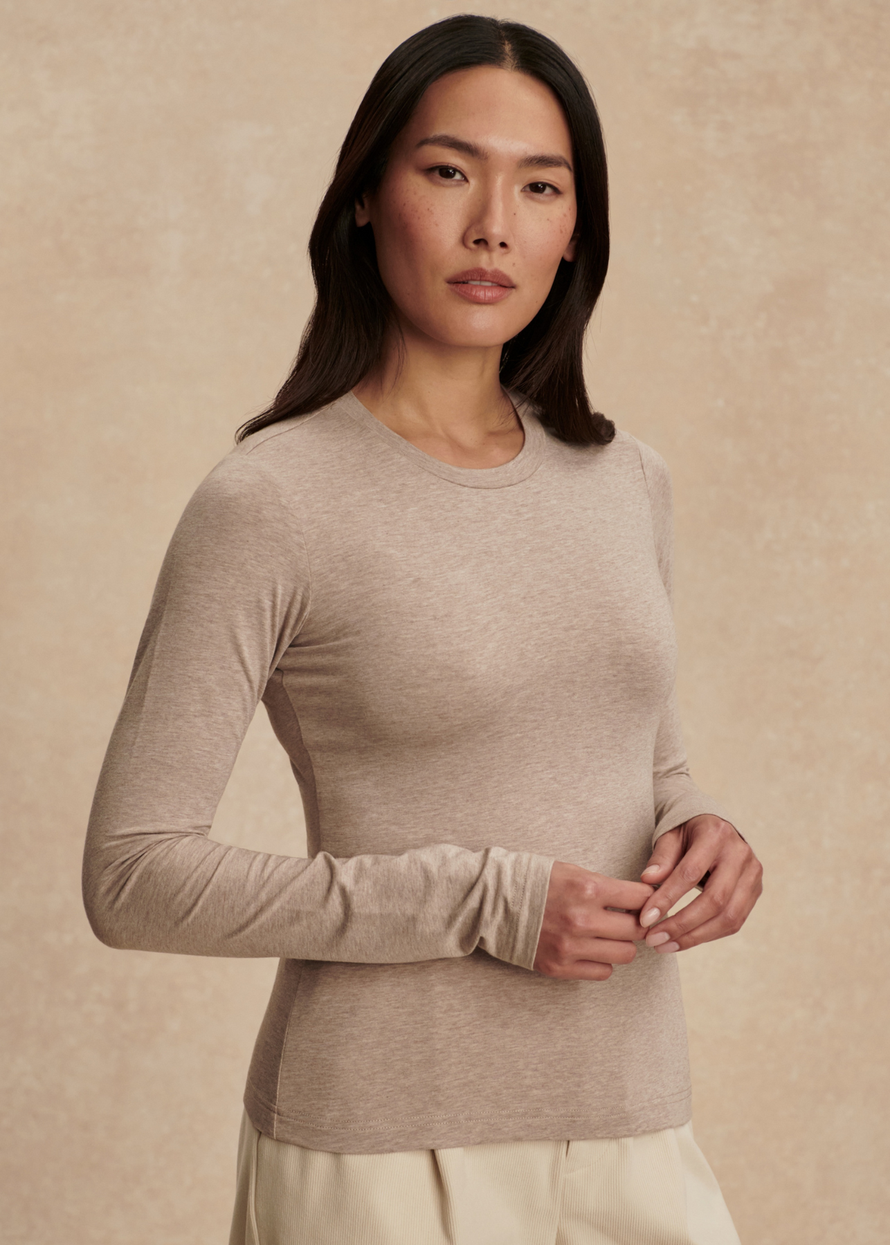 This fitted longsleeve tee is the perfect base layer to wear underneath a jacket or vest, but works just as well when worn solo. Crafted from Soft Modal Jersey, it has a super soft texture and offers breathability, ideal for everyday layering. It is cut to a slim, slightly cropped shape inspired by the Regina tee, featuring a close-fitting crew neck, flattering shaping at the waist, and set-in sleeves.