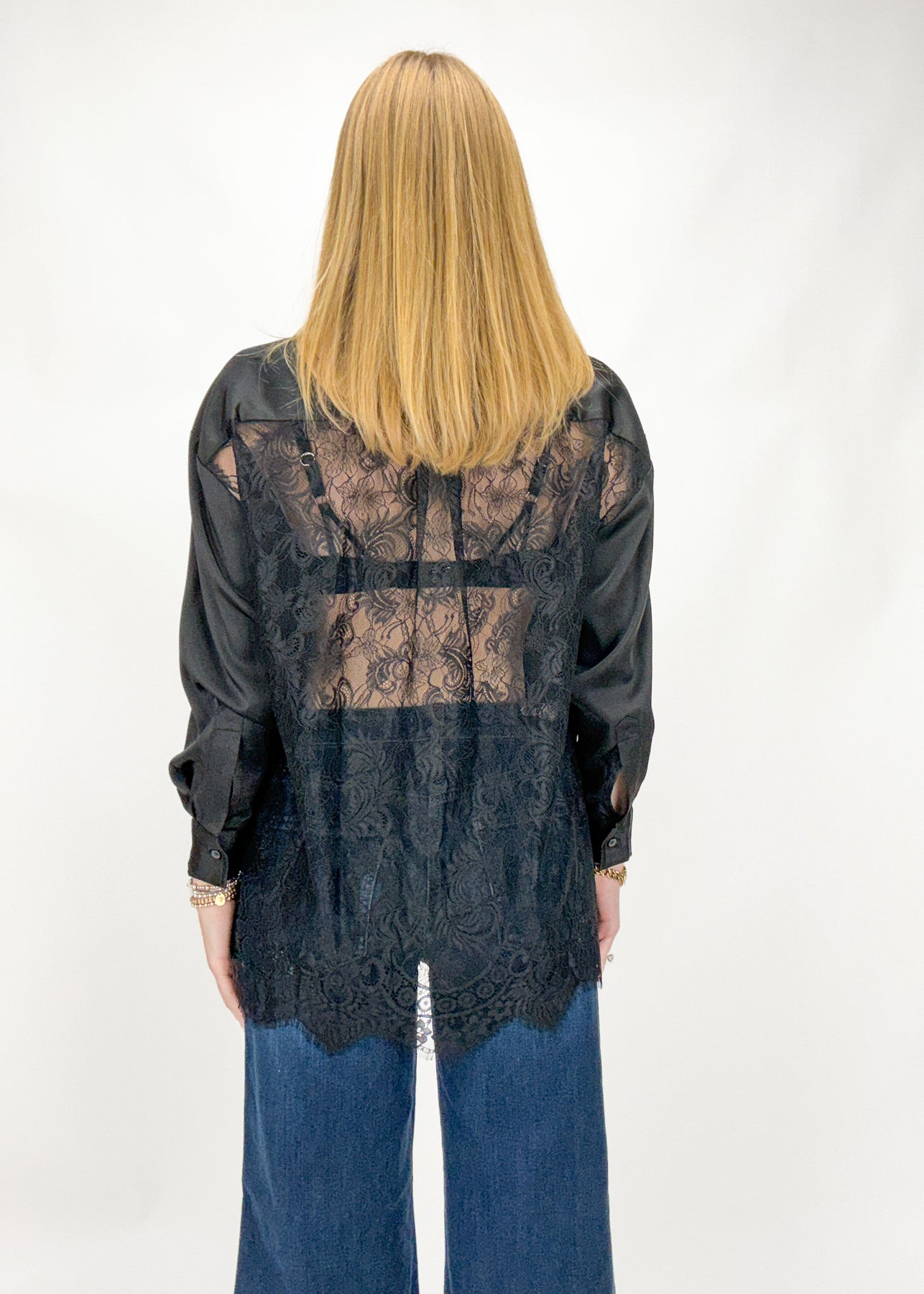 Add a pop of subtle charm to your capsule wardrobe with this classic black button down featuring lace detailing.