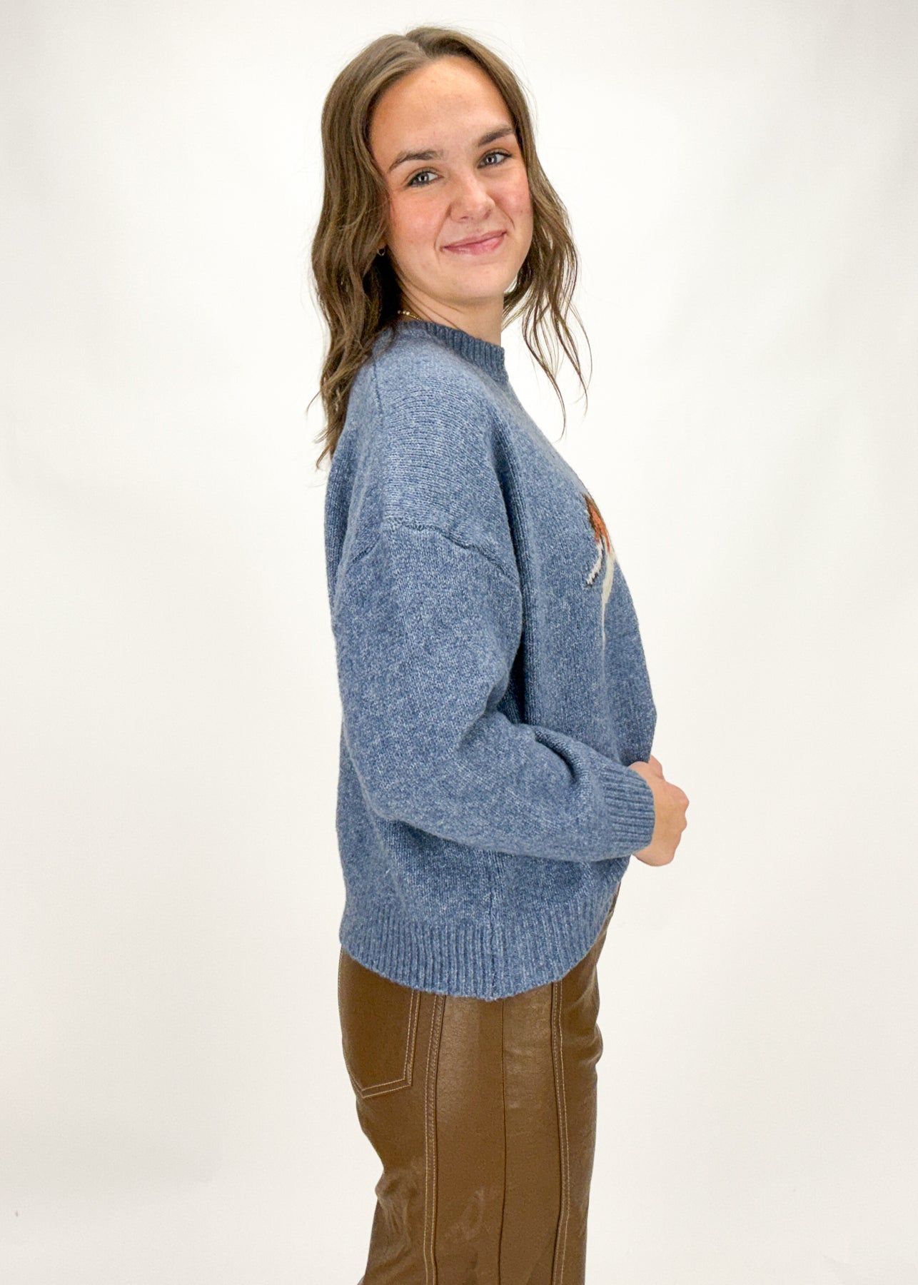 Your new go-to sweater has arrived! This lightweight knit comes in an antique blue color and features a dog graphic for a truly unforgettable look.