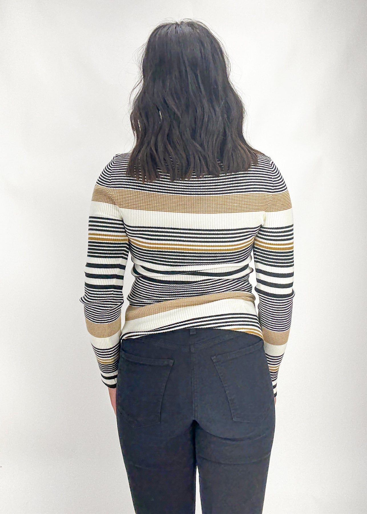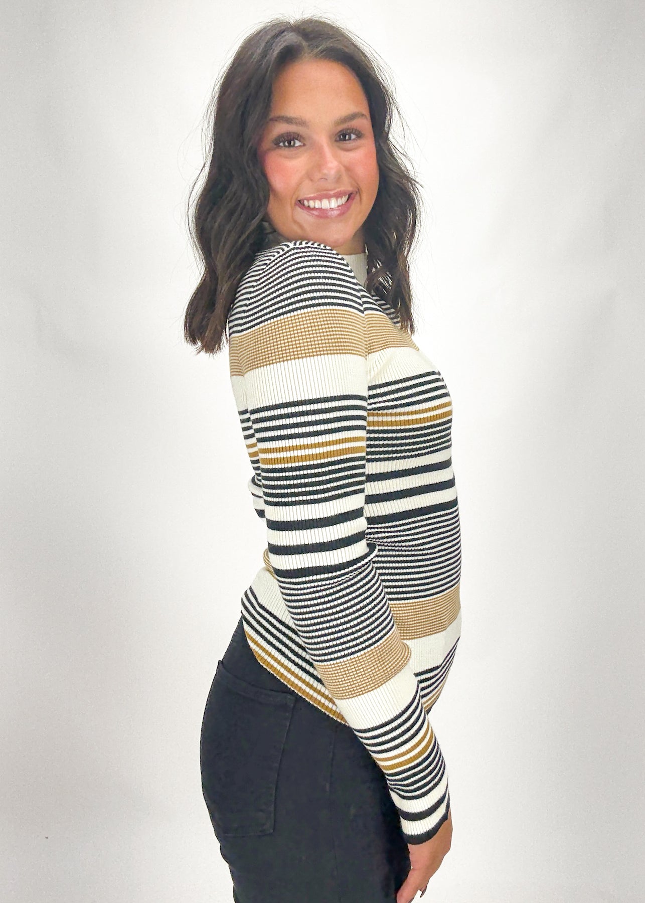 Turn heads in this cozy striped sweater! With a bold mock neck and a black striped color combo, this piece is sure to make a statement.