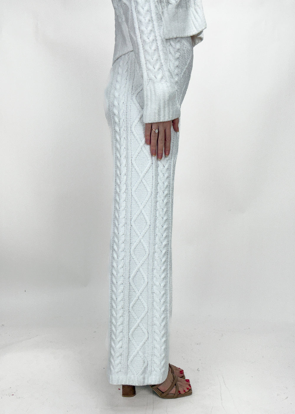 Experience elite comfort in these cozy cable knit pants. In a warm ivory, these pants are perfect for pairing with your favorite sweatshirt on a chill day.